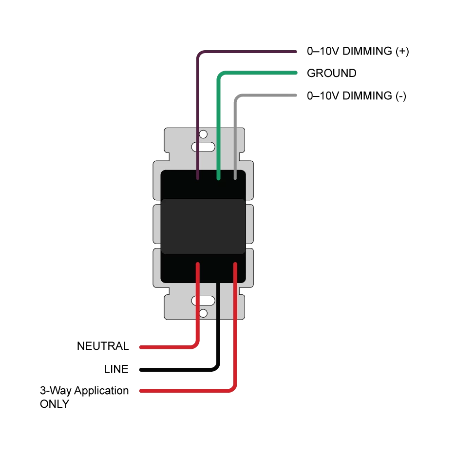 Use this 0-10V LED switch and slide dimmer on LED fixtures, such as panels and high-bay lights, with 0-10V dimming capabilities. It has a paddle for on/off functionality and a small slider for dimming. Use the 3-way switch to control lights from two locations. Integrated high- and low-end trim adjustment dials allow access to the lowest and highest light levels without flickering. The dimmer is rated for six amps at 120 VAC or three amps at 277 VAC (amps = fixture wattage/voltage).