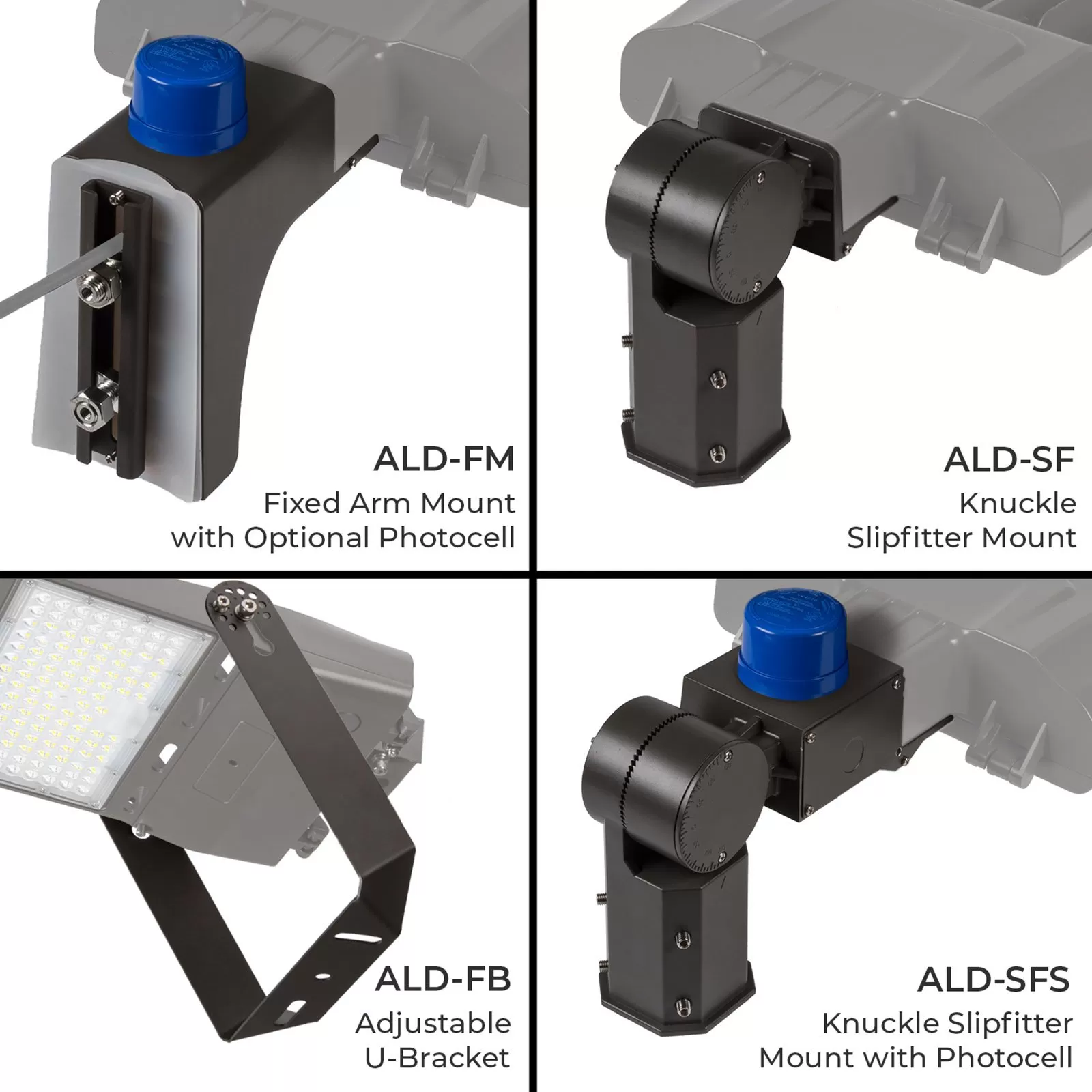 This 100W LED parking lot area light emits 17,000 lumens of cool white light in a focused Type III-S distribution pattern. Type III-S distributes light farther forward for lighting broader pathways and roadways. See our guide on distribution types for more information. The 100-watt LED area light fixture replaces 250-watt metal-halide (MH) lights with comparable output and has a high 170lm/W efficacy. It has a waterproof die-cast aluminum housing and a shatterproof polycarbonate lens. Use an optional photocell with a compatible mount for automatic dusk-to-dawn operation and added energy savings. Multiple mounting options are available. Use it for roadway lighting, billboards, parking lots, and general area lighting.