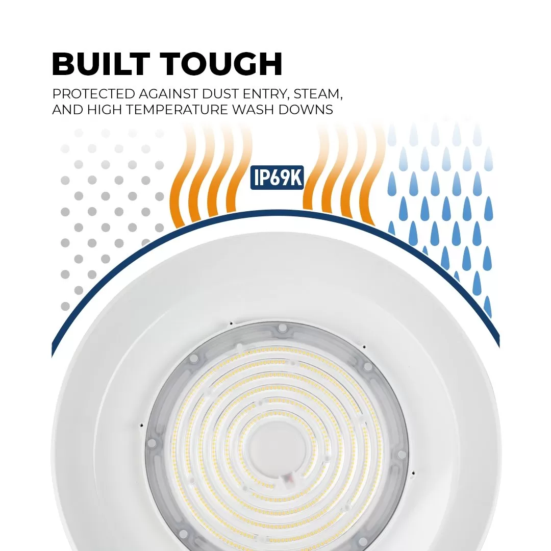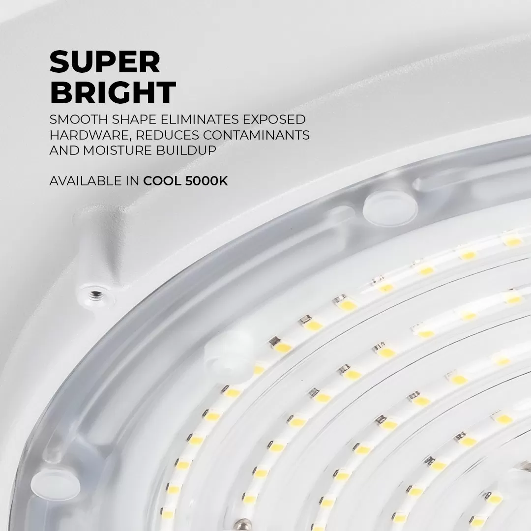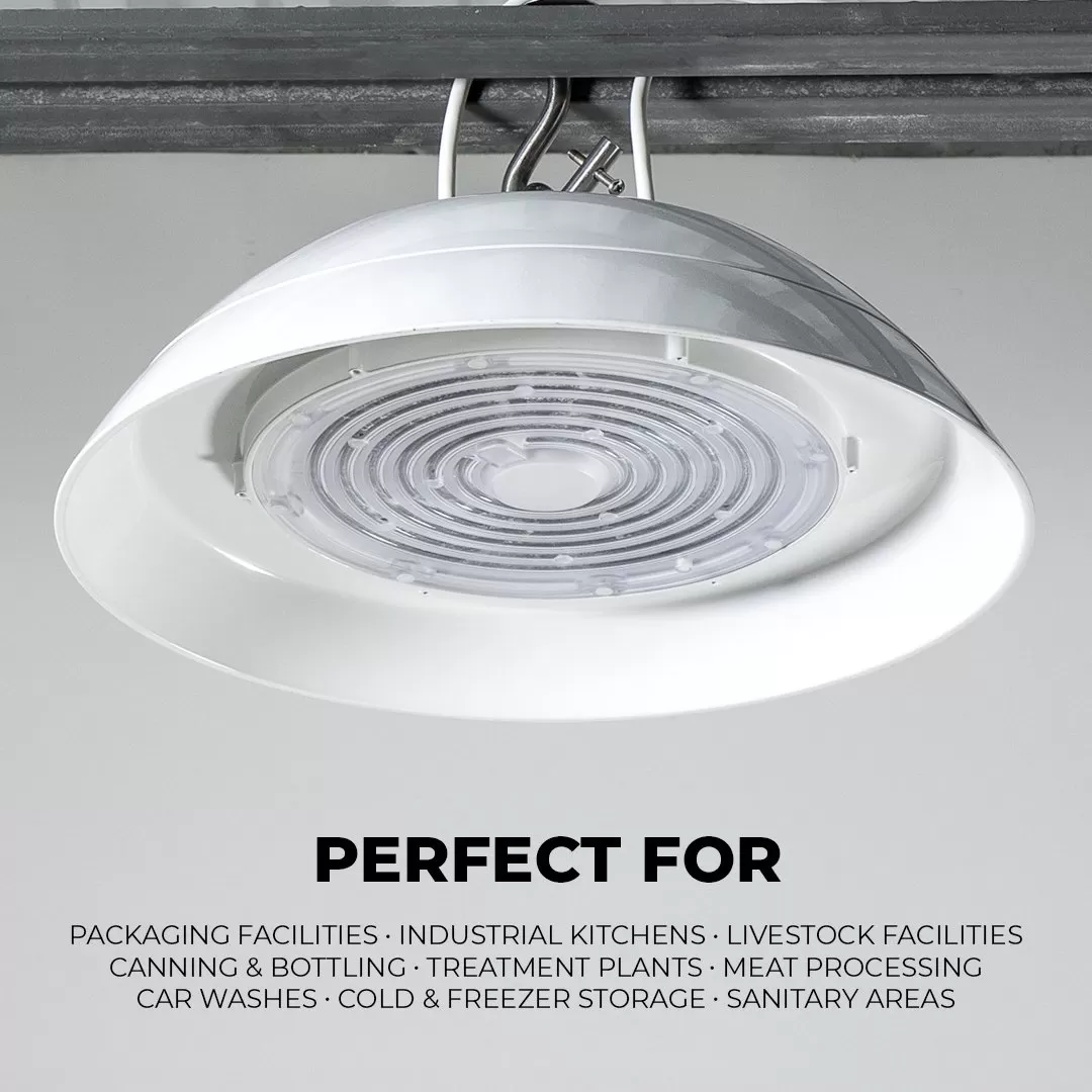 The 100W LED UFO High Bay Washdown Light Fixture is NSF compliant and meets FDA/USDA guidelines for food and beverage processing and other controlled environments. The smooth shape eliminates exposed hardware and prevents the accumulation of contaminants and moisture. With an IP69K rating, this high bay can withstand high-pressure, high-temperature hose-downs for comprehensive cleaning. The white powder-coated aluminum construction is lightweight, corrosion-resistant, and glass free to meet safety requirements. LEDs provide dimmable, uniform illumination for areas that require higher vertical light levels. The fixture replaces 250W HID or metal halide equivalents offering 13,000 lumens of 5000K cool white light. Also available in a 150W version.