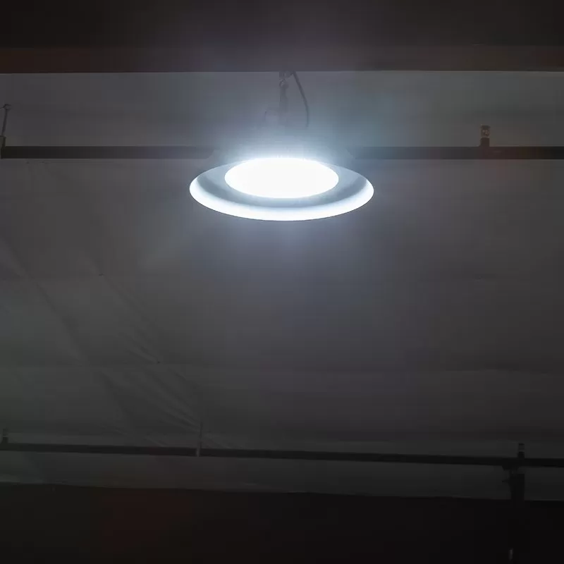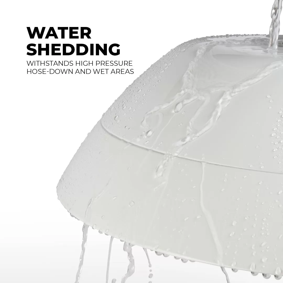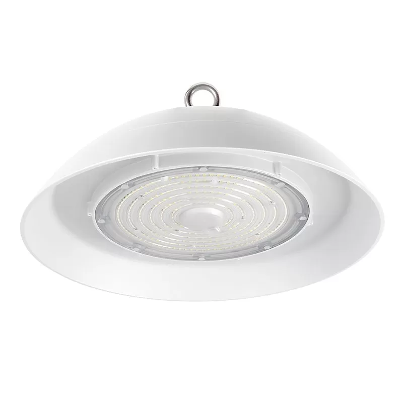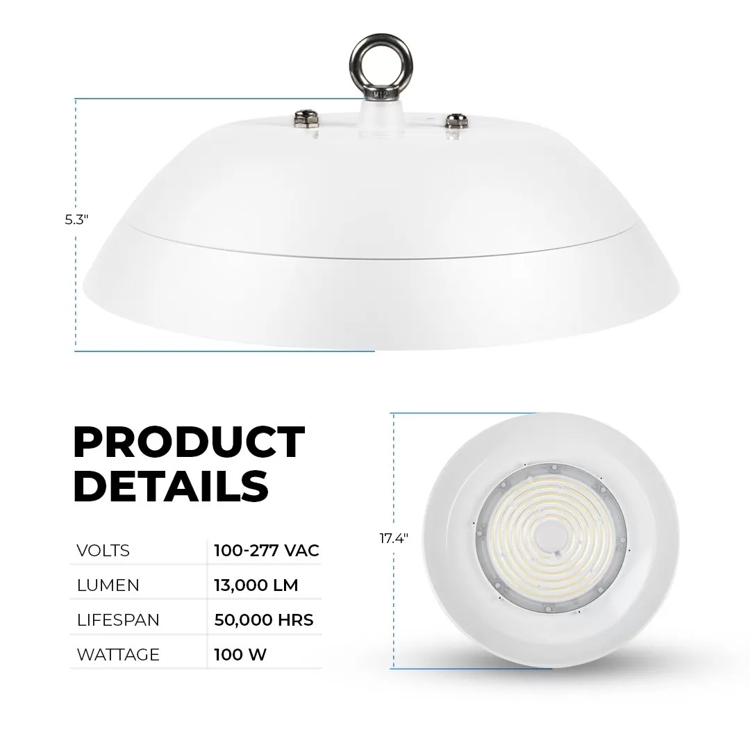The 100W LED UFO High Bay Washdown Light Fixture is NSF compliant and meets FDA/USDA guidelines for food and beverage processing and other controlled environments. The smooth shape eliminates exposed hardware and prevents the accumulation of contaminants and moisture. With an IP69K rating, this high bay can withstand high-pressure, high-temperature hose-downs for comprehensive cleaning. The white powder-coated aluminum construction is lightweight, corrosion-resistant, and glass free to meet safety requirements. LEDs provide dimmable, uniform illumination for areas that require higher vertical light levels. The fixture replaces 250W HID or metal halide equivalents offering 13,000 lumens of 5000K cool white light. Also available in a 150W version.