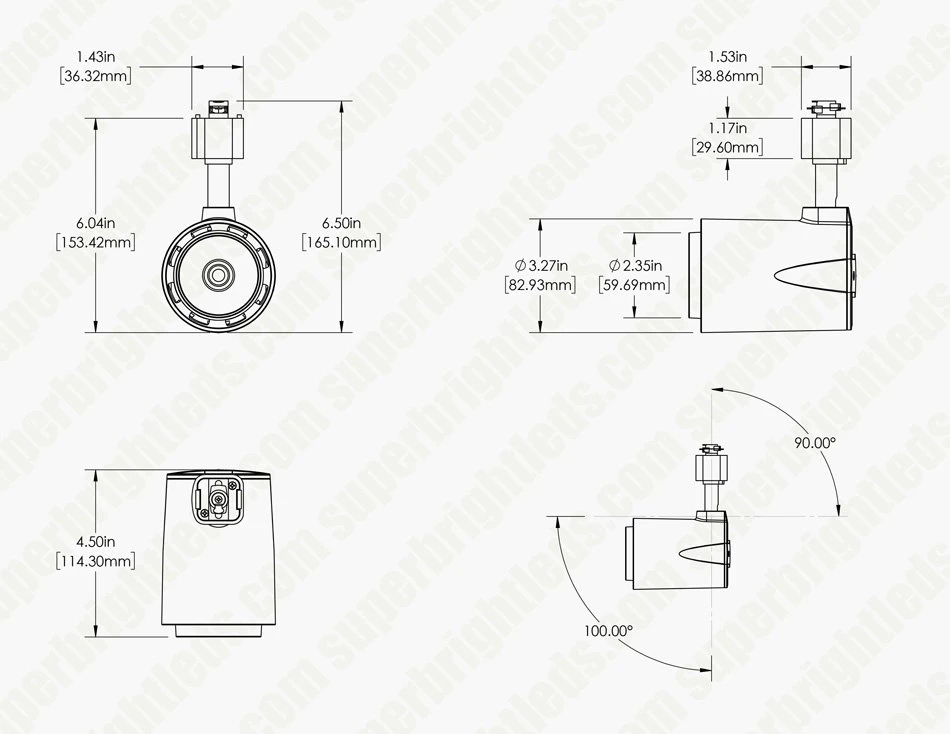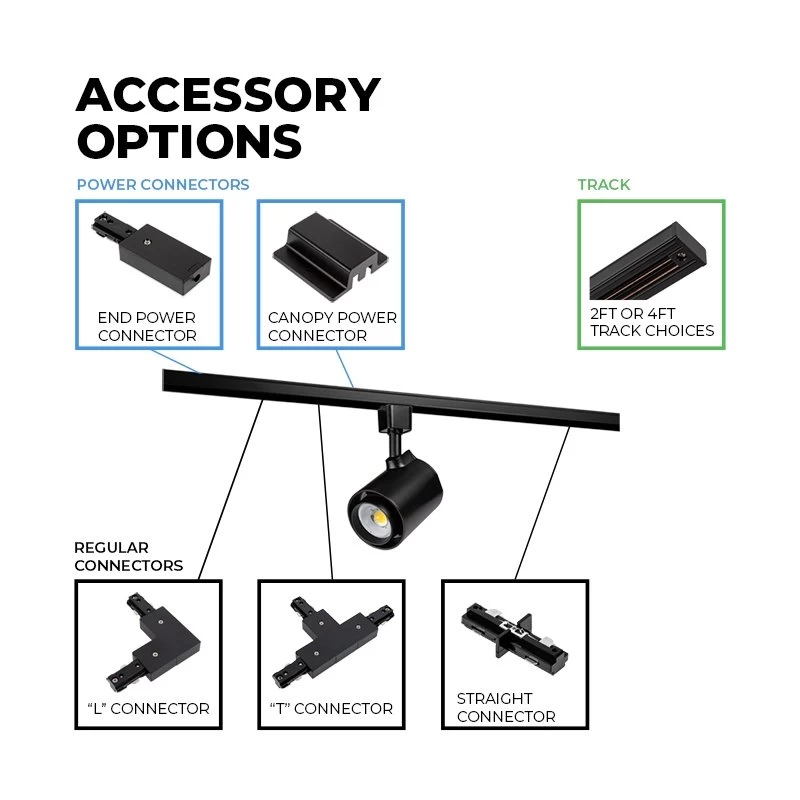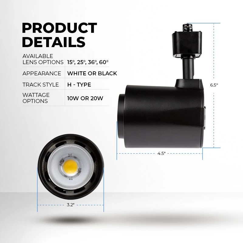 Dimmable Track Light Heads offer an adjustable, scalable lighting solution for residential and commercial locations. Structural arm provides a wide range of motion yet maintains placement for precise illumination. Long-lasting, energy-efficient, integrated COB LED provides high-quality, zero maintenance light. With standard line voltage, mount to a compatible H track system. With 90+ CRI, use one or multiple track heads to highlight artwork, architecture, retail products, or accent lighting. 60° beam angle can also provide task light for lower ceiling applications. A full suite of accessories are available to customize beam spread and track system.