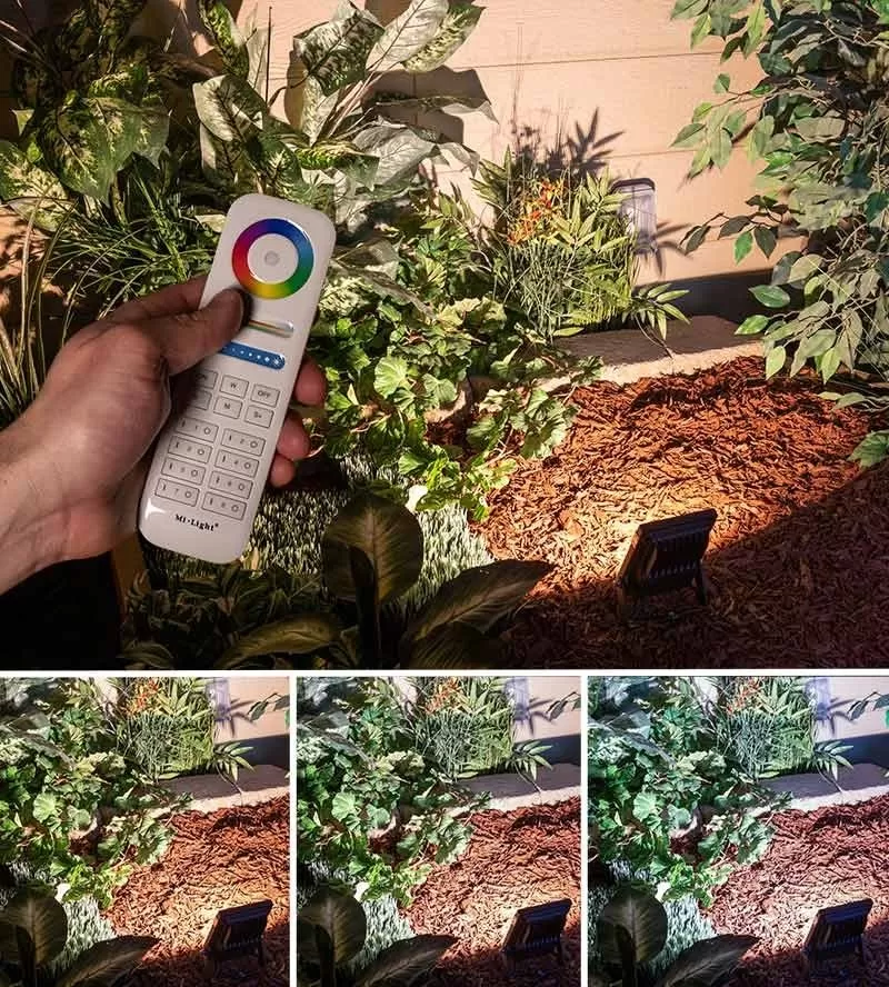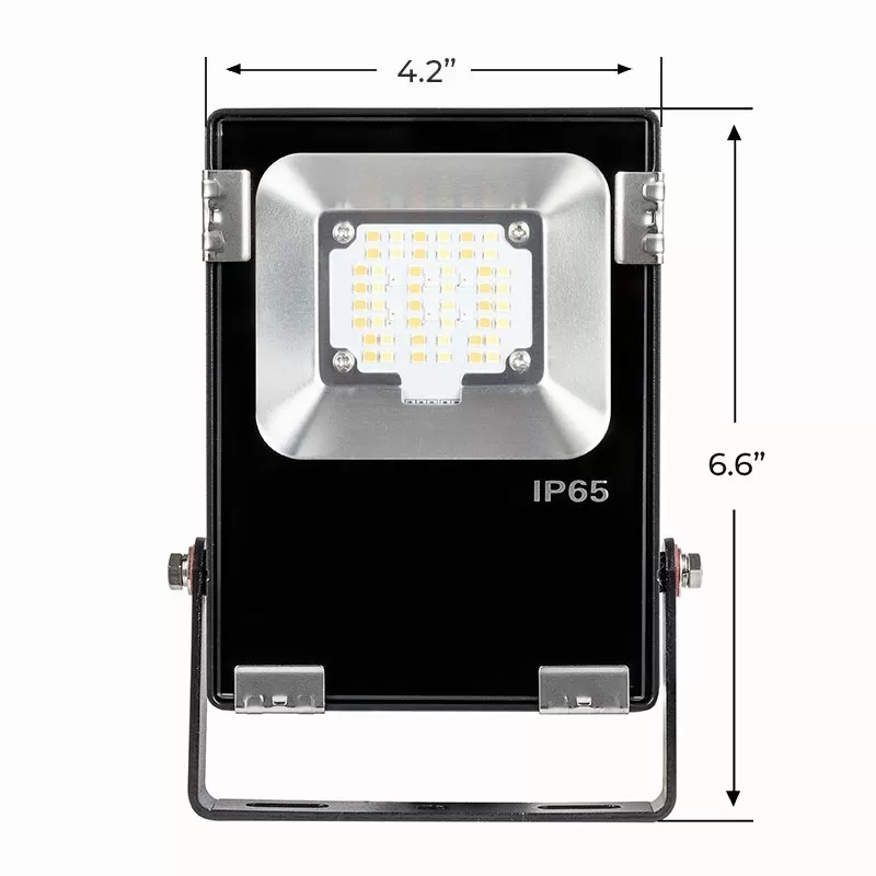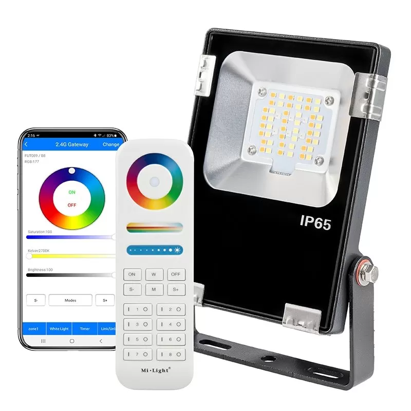 FL-RGBCCT series LED Flood Light has wireless control options to bring convenient, tunable light to both outdoor landscapes and venues. with a wide 120° beam angle, integrated RGB+Tunable White LEDs create the full spectrum of colors and whites. Select from the many dynamic patterns and single color choices, as well as adjust brightness, chase speed, and more. Control with a compatible RF remote, or pair with the MiBoxer WiFi Hub and app to control from a smart device. Durable build will with stand extreme weather conditions and commercial application, while sleek design will compliment event spaces or other decorative environments.
