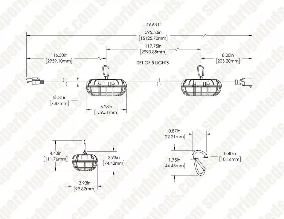 The 125W LED Temporary String Work Light provides 15,625 lumens for workplaces, construction sites, garages, or emergency scenes. The 50ft 5 bulb string has LED lamps spaced 10ft apart for a wide distribution of light. The polycarbonate housing and lens protects the LEDs from dust and water. Hang the LED fixtures using the included carabiners, and link up to 3 separate 50ft strings. Suitable for both indoor and outdoor usage.