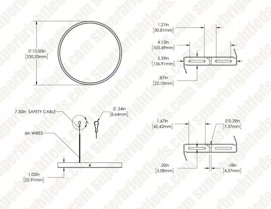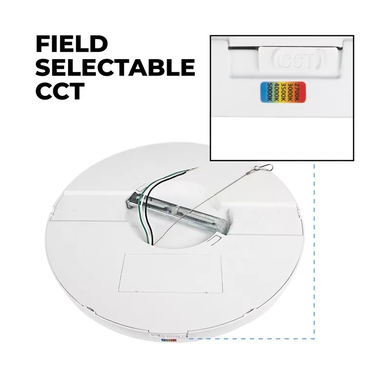 The 13-inch LED downlight features five field-selectable color temperatures. During installation, select the color temperature that best matches the application by using the slide switch on the side of the downlight. The frosted polycarbonate lens diffuses light and creates uniform light distribution. The slim, low-profile downlight flush mounts to a junction box using the included bracket. Use the attached safety cable to simplify installation and increase safety. Install in new construction, retrofits, and remodels. Perfect for bathroom, kitchen, and office lighting.