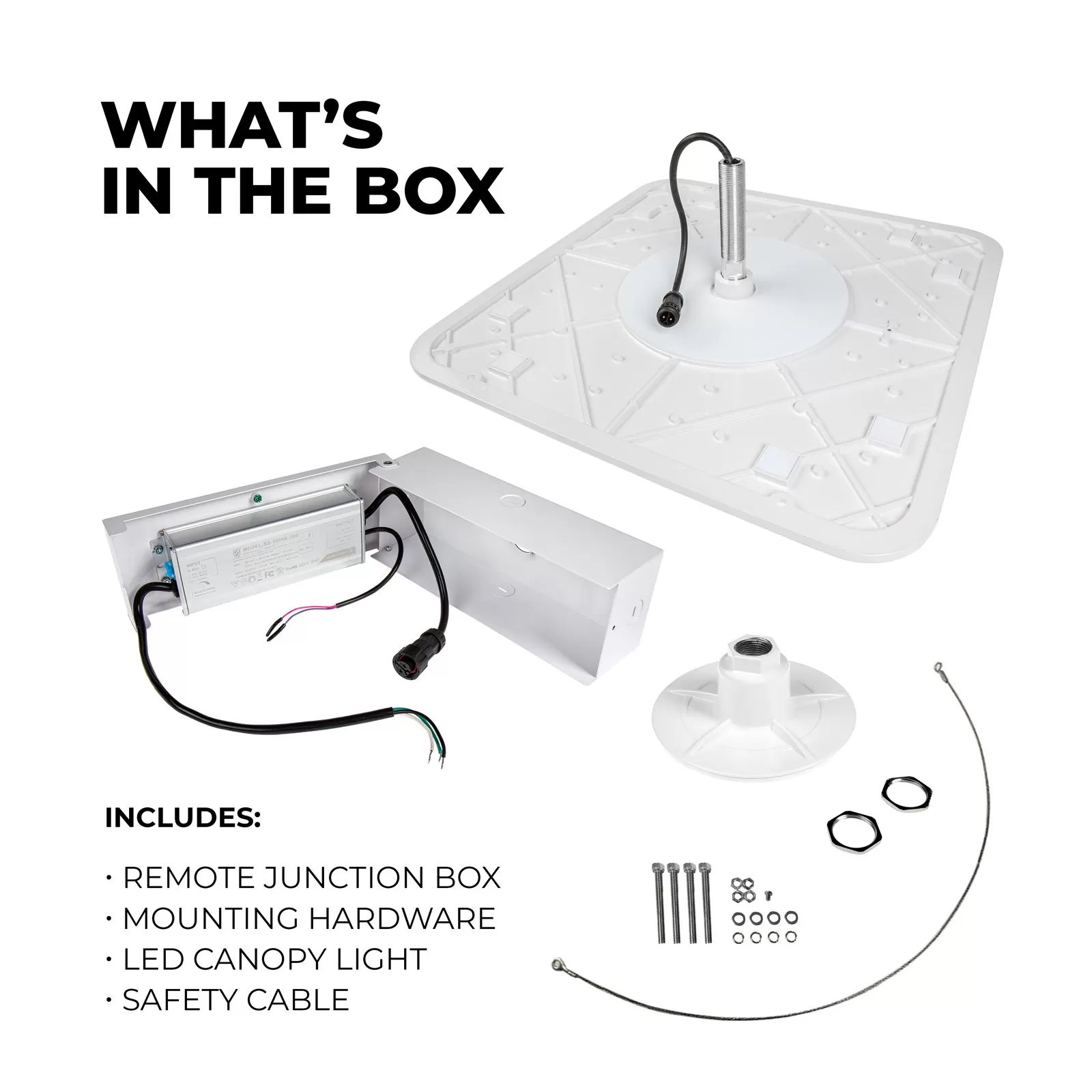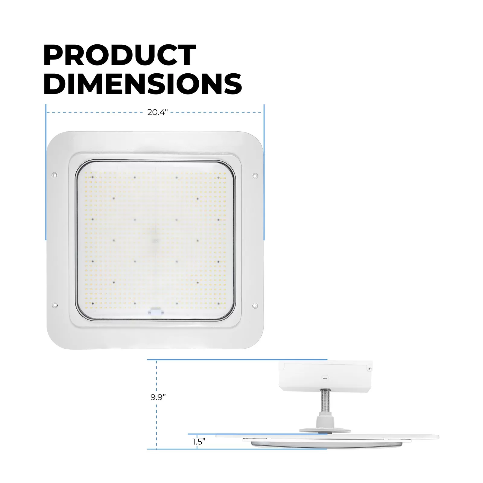 The energy-saving 150W LED Gas Station Canopy Light replaces 400W metal halide fixtures. It has a 110-degree beam angle and provides 21,000 lumens in a 5000K cool-white color. Comes with built-in surge protection, and is installed using the surface mount, the included conduit, and junction box. The durable, aluminum housing and polycarbonate lens are IP65 waterproof rated for outdoor use. Ideal for gas stations and parking garages.