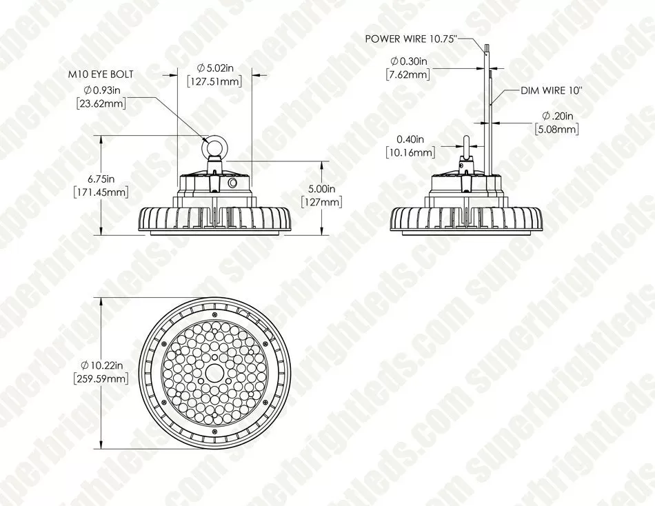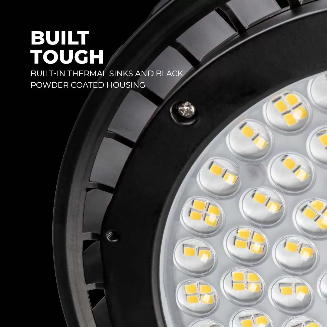 The round LED high bay is designed to lower maintenance costs by replacing traditional metal halide fixtures. The high bay is constructed with a powder-coated aluminum housing and polycarbonate lens for durability. The waterproof IP65 rating allows the fixture to withstand outdoor weather conditions. Install the fixture using the included stainless steel eye hook or use a compatible microwave motion sensor to maximize energy savings (sold separately).