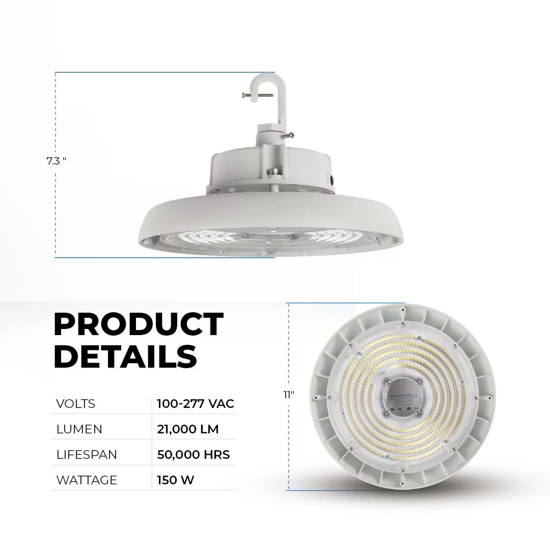 This LED UFO high bay light was designed to replace a 400W metal halide fixture. The low-profile is constructed with white powder-coated aluminum and an included polycarbonate reflector for uniform light distribution. Rated IP65, the high bay resists corrosion and moisture. Install with the included mounting hook and safety cable. Ideal for commercial applications such as warehouses, gymnasiums, and factories.