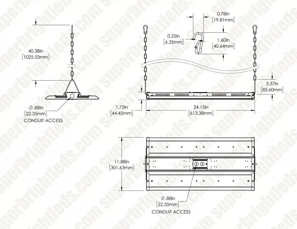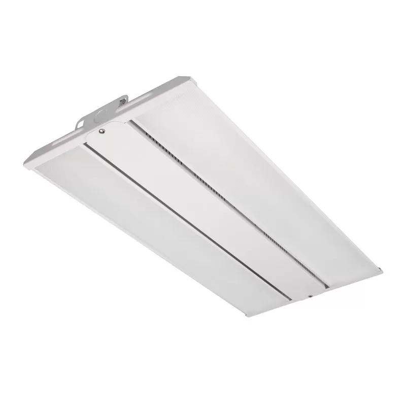 Replace conventional fluorescent and metal halide fixtures in warehouses, distribution centers, and grocery stores. The LED linear high bay delivers 23,100 lumens with a wide Type V light distribution. Steel housing is powder coated for added durability and the impact-resistant polycarbonate lens diffuses light. High 140 lm/W efficacy maximizes energy savings. Mount using the included suspension mounting kit or use the optional pendant mounting kit for pendant mounting and surface mounting.