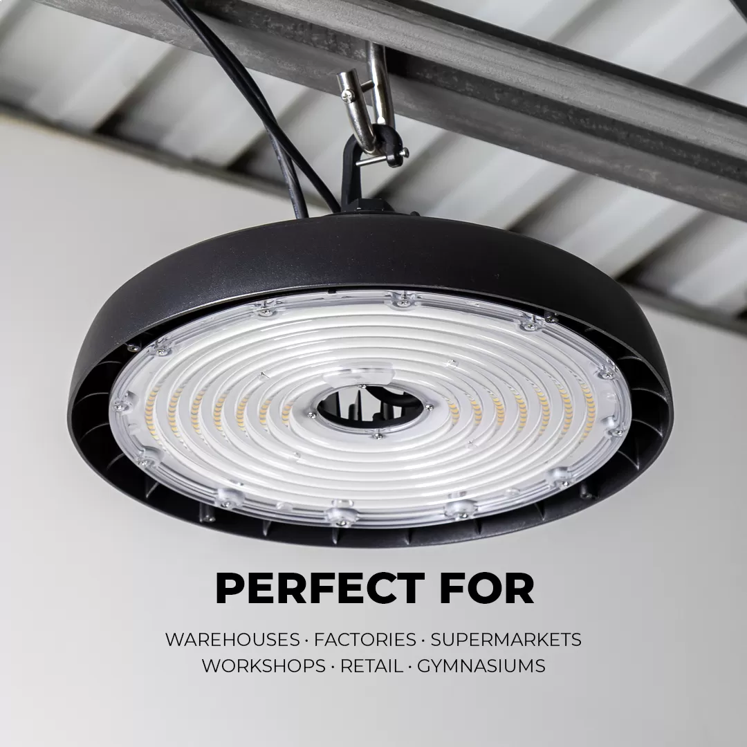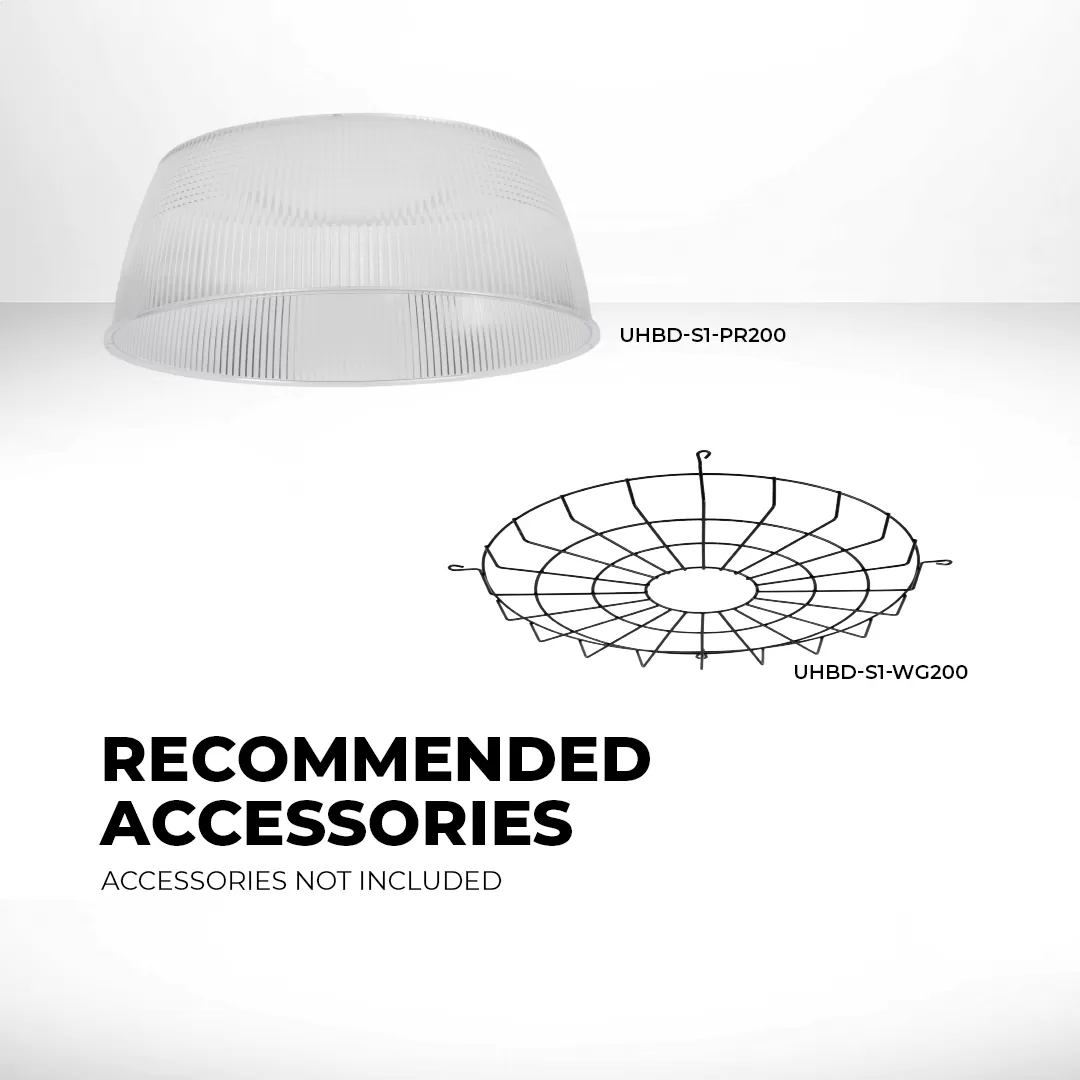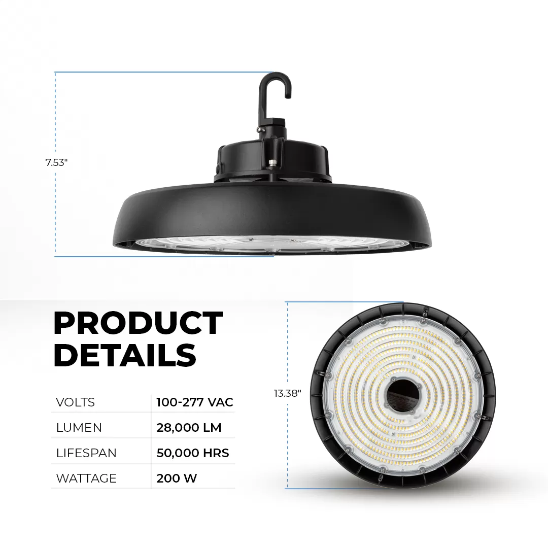 Provide even illumination for tall ceiling applications with UHBD-S1 series UFO LED High Bay. An improved alternative to traditional metal halides, the design is more compact and efficient. Low profile aluminum housing has built-in heat sinks for passive cooling. Powder coated exterior and IP65 rating resists corrosion and moisture. Integrated LEDs deliver up to 140 lumens per watt, with a polycarbonate lens designed to reduce glare.