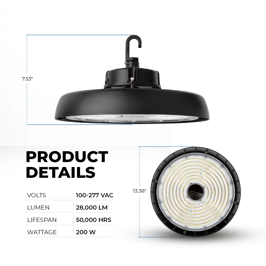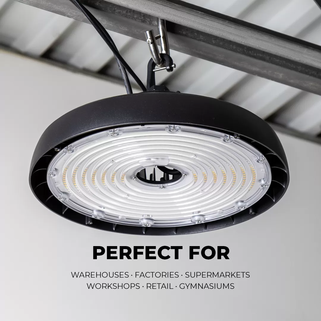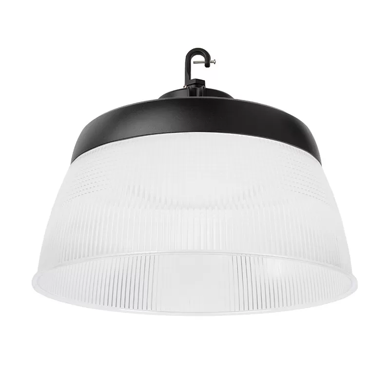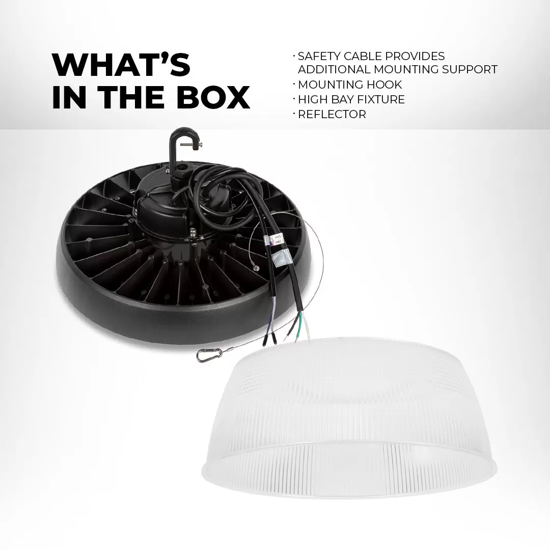 This LED UFO high bay light was designed to replace a 750W metal halide fixture. The low-profile is constructed with powder-coated aluminum and an included polycarbonate reflector for uniform light distribution. Rated IP65, the high bay resists corrosion and moisture. Install with the included mounting hook and safety cable. Ideal for commercial applications such as warehouses, gymnasiums, and factories.