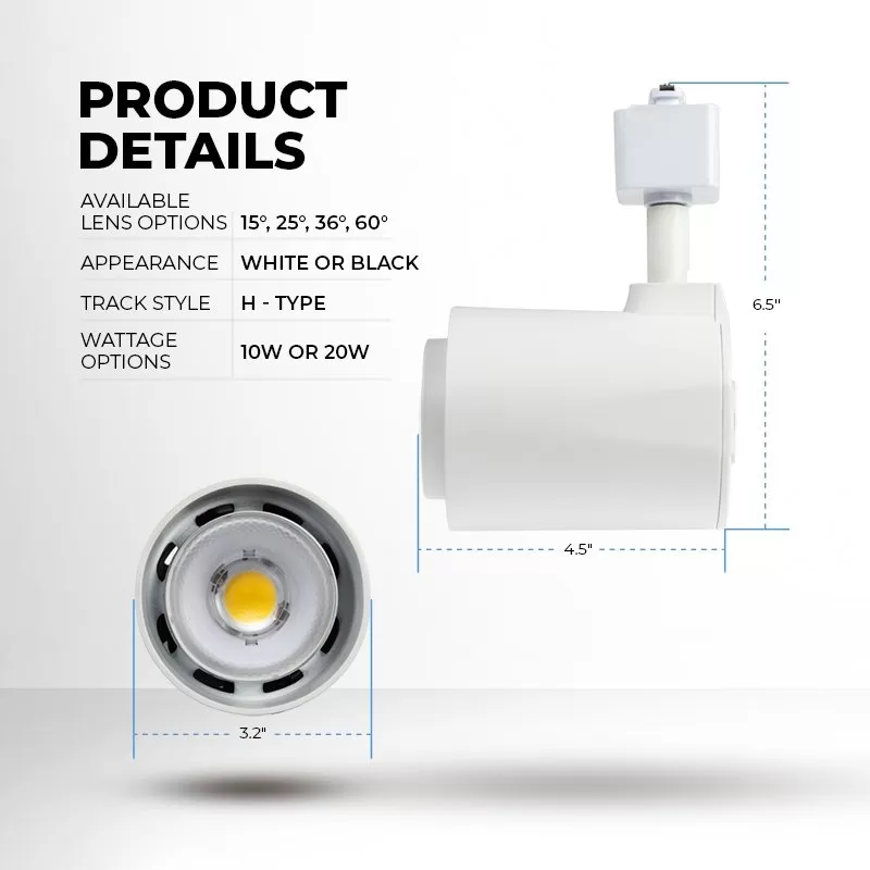 Dimmable Track Light Heads offer an adjustable, scalable lighting solution for residential and commercial locations. Structural arm provides a wide range of motion yet maintains placement for precise illumination. Long-lasting, energy-efficient, integrated COB LED provides high-quality, zero maintenance light. With standard line voltage, mount to a compatible H track system. With 90+ CRI, use one or multiple track heads to highlight artwork, architecture, retail products, or accent lighting. 60° beam angle can also provide task light for lower ceiling applications. A full suite of accessories are available to customize beam spread and track system.