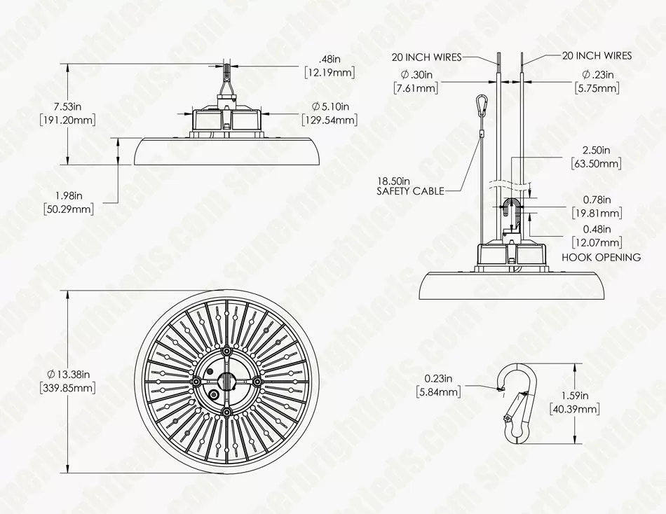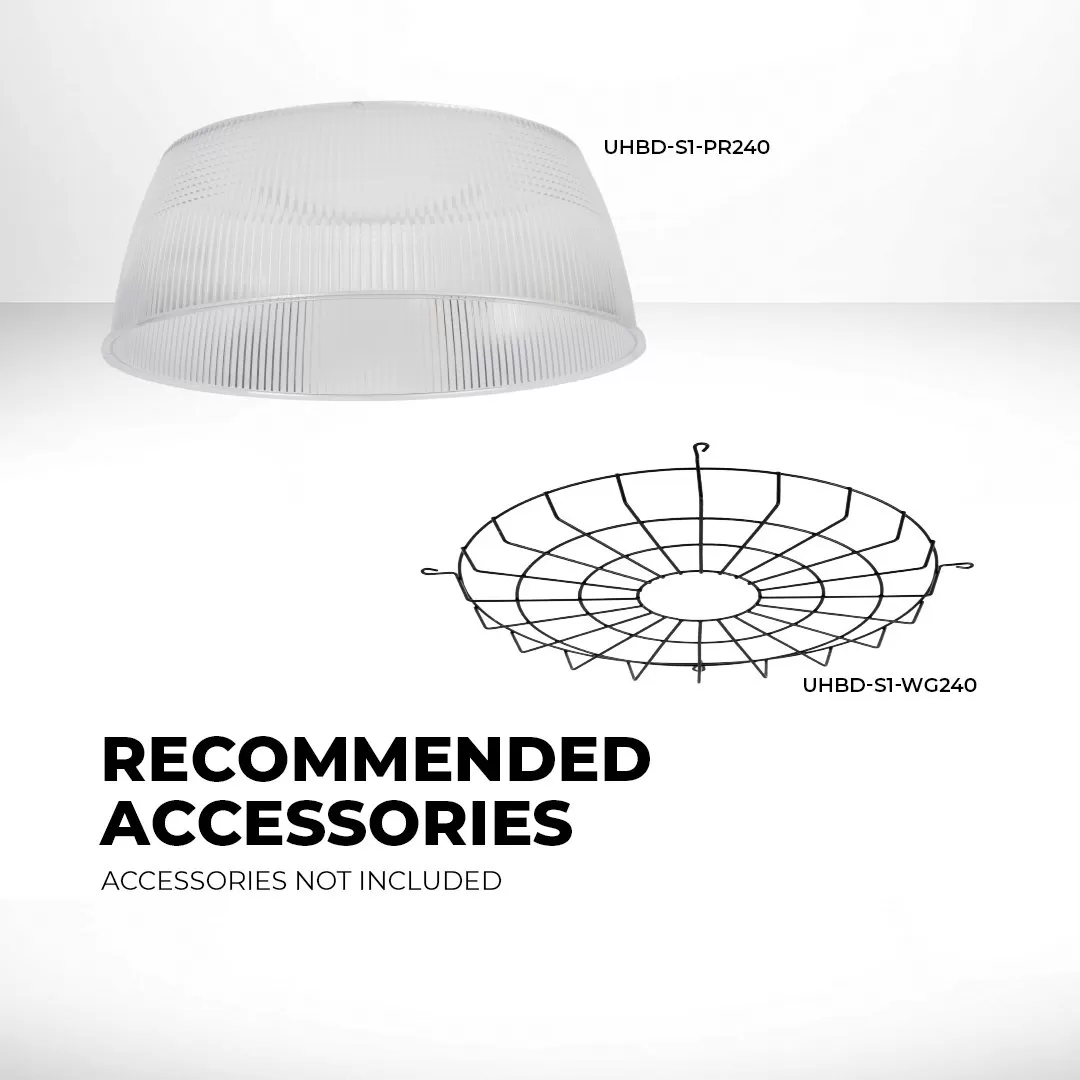 Provide even illumination for tall ceiling applications with UHBD-S1 series UFO LED High Bay. An improved alternative to traditional metal halides, the design is more compact and efficient. Low profile aluminum housing has built-in heat sinks for passive cooling. Powder coated exterior and IP65 rating resists corrosion and moisture. Integrated LEDs deliver up to 140 lumens per watt, with a polycarbonate lens designed to reduce glare.