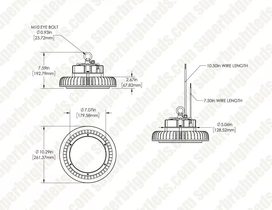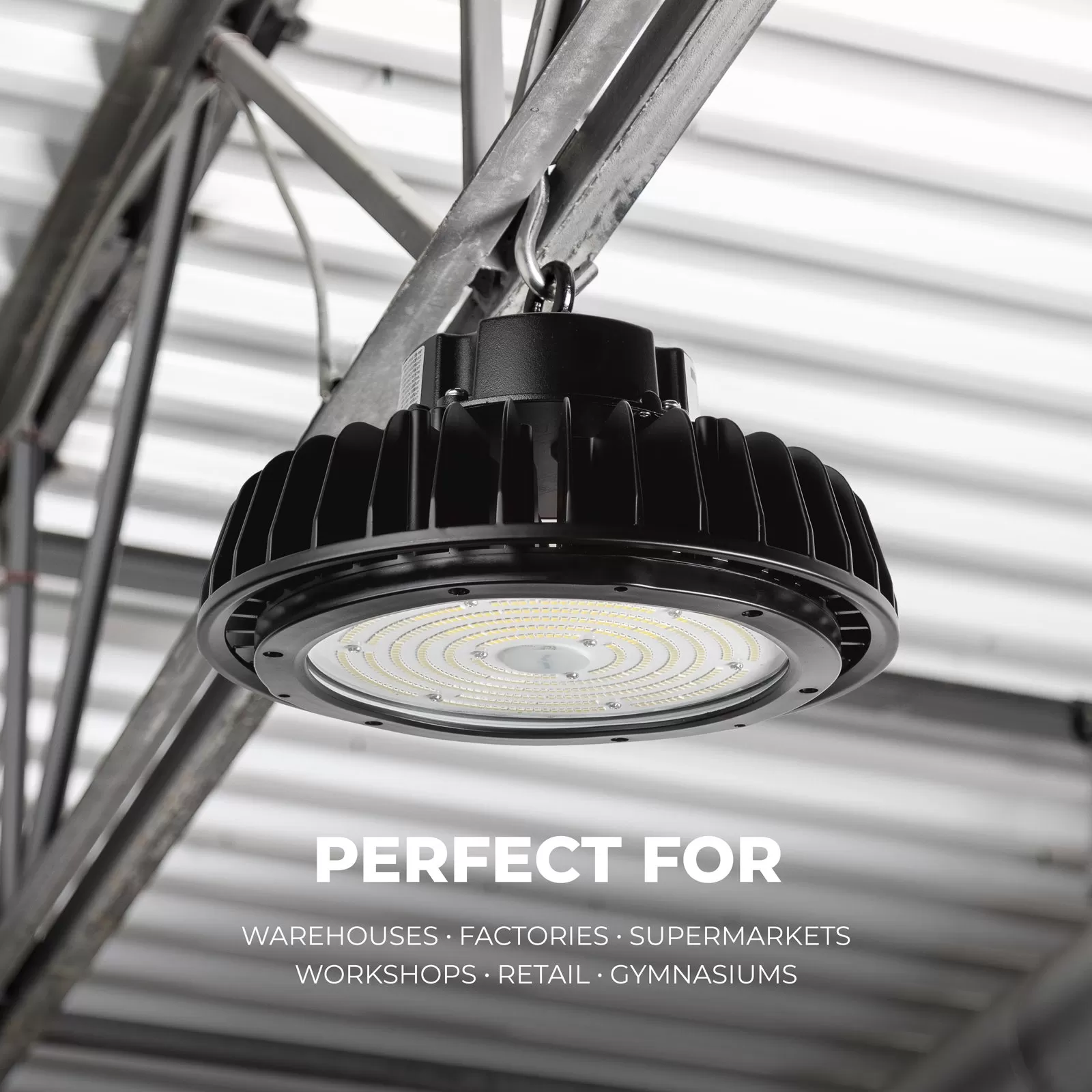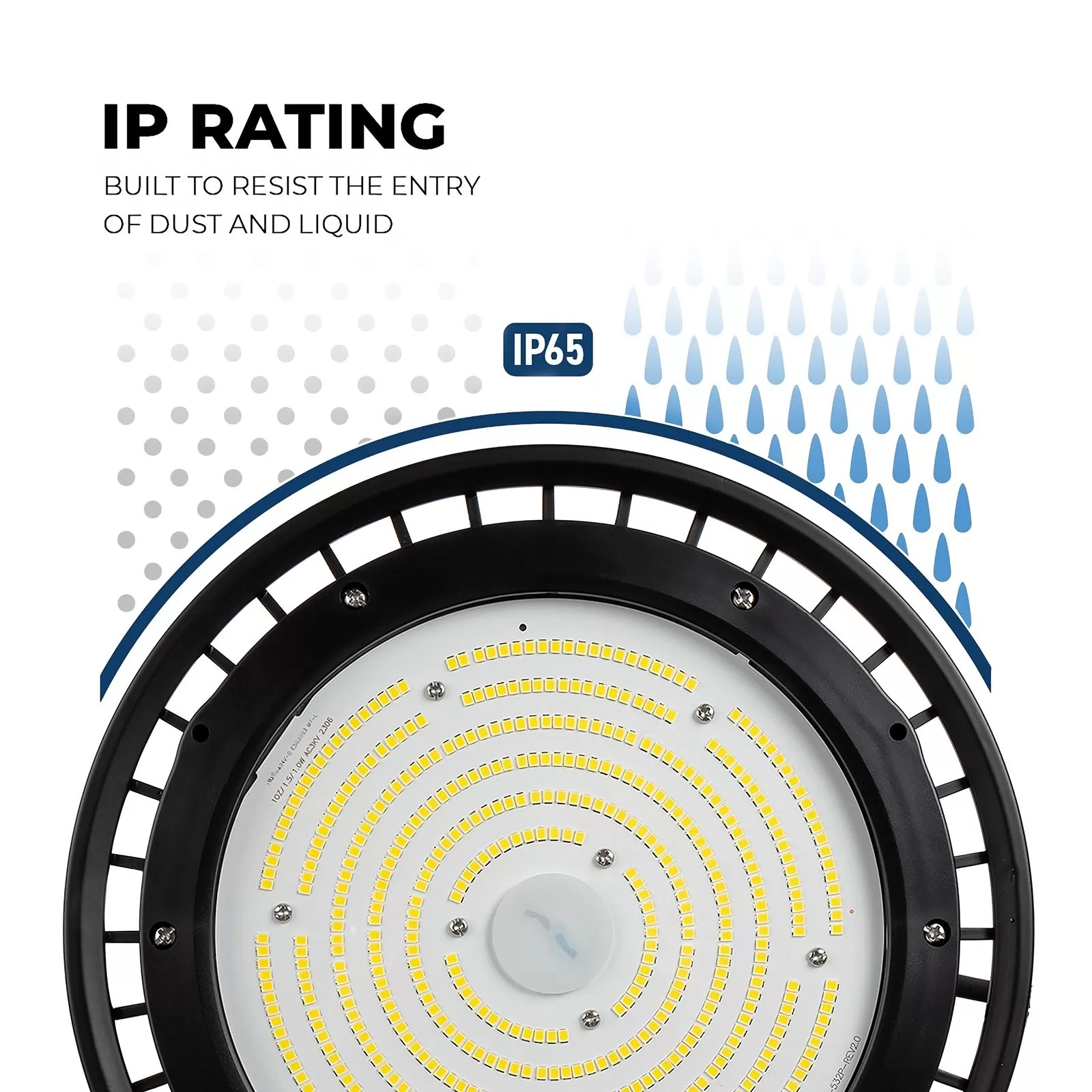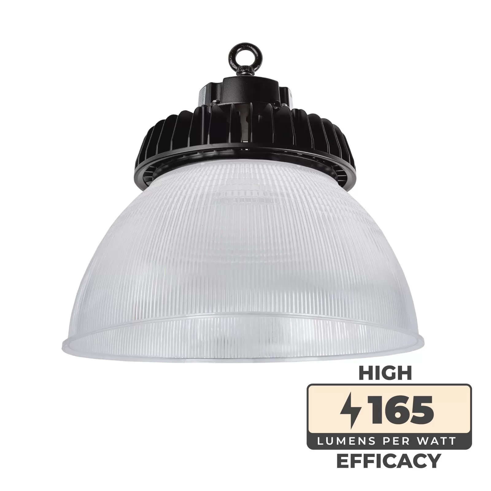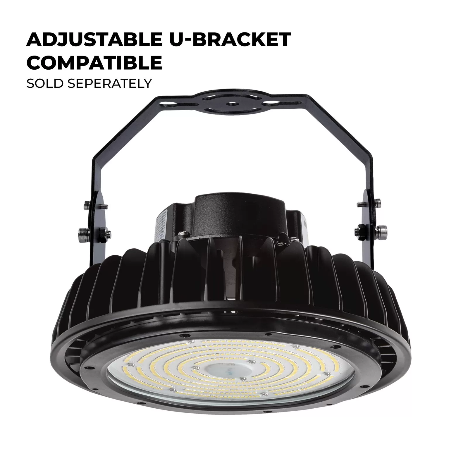 The 240W UFO LED high bay is a low-maintenance replacement for traditional metal-halide fixtures up to 1000 watts. High-efficiency LED technology delivers 39,600 lumens of cool white area lighting. The round high bay has a powder-coated aluminum housing, a clear glass lens, and a polycarbonate reflector for uniform light distribution and a traditional look. An IP65 waterproof rating allows the fixture to withstand outdoor weather conditions. Install using the included stainless steel eye hook or compatible adjustable U-bracket (sold separately). Install an optional microwave motion sensor to maximize energy savings.