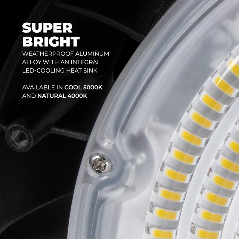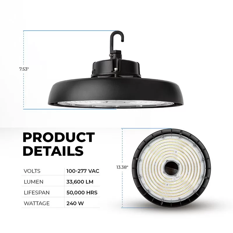 This LED UFO high bay light was designed to replace a 1000W metal halide fixture. The low-profile is constructed with powder-coated aluminum and an included polycarbonate reflector for uniform light distribution. Rated IP65, the high bay resists corrosion and moisture. Install with the included mounting hook and safety cable. Ideal for commercial applications such as warehouses, gymnasiums, and factories.