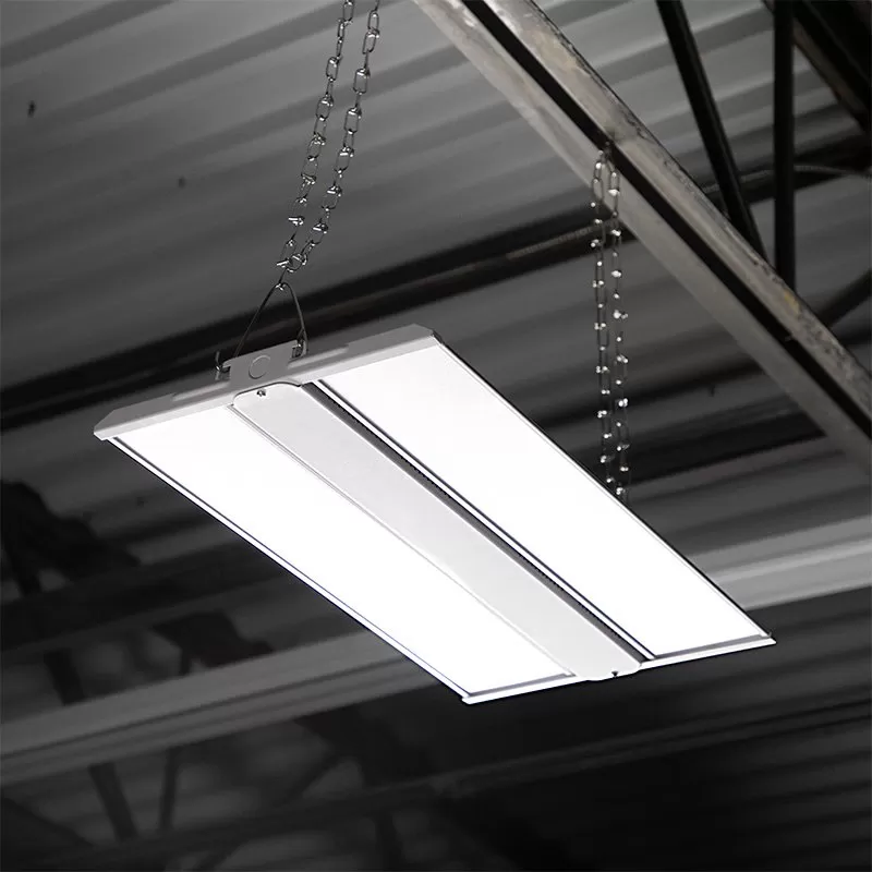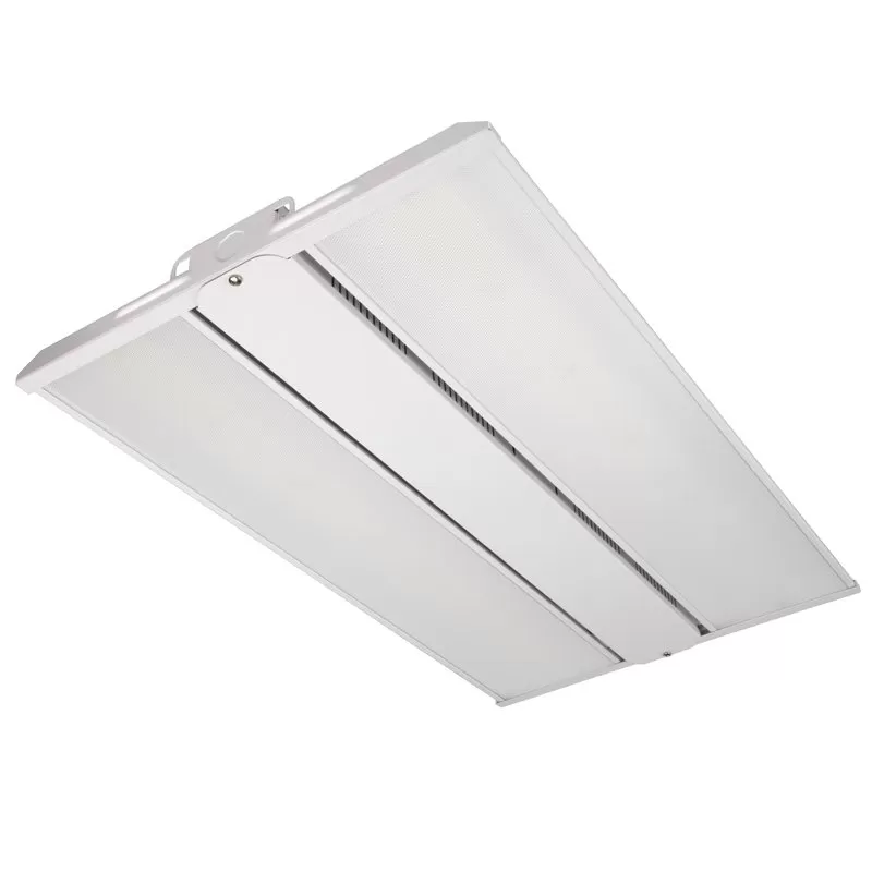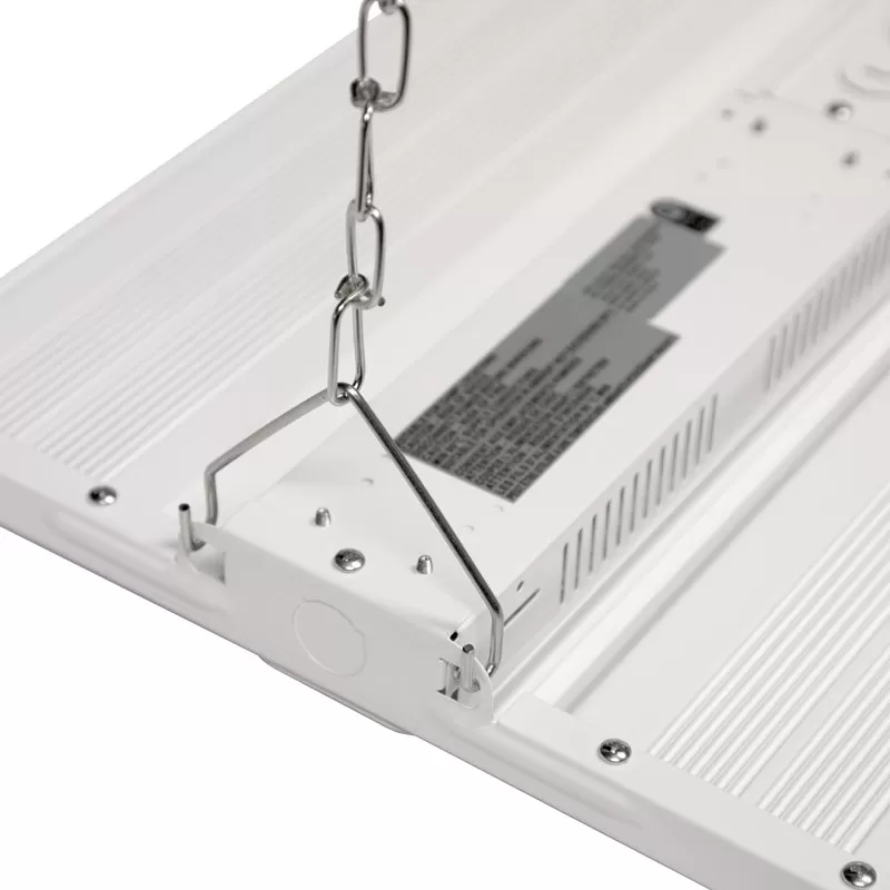 Replace conventional fluorescent and metal halide fixtures in warehouses, distribution centers, and grocery stores. The LED linear high bay delivers 35,700 lumens with a wide Type V light distribution. Steel housing is powder coated for added durability and the impact-resistant polycarbonate lens diffuses light. High 140 lm/W efficacy maximizes energy savings. Mount using the included suspension mounting kit or use the optional pendant mounting kit for pendant mounting and surface mounting.