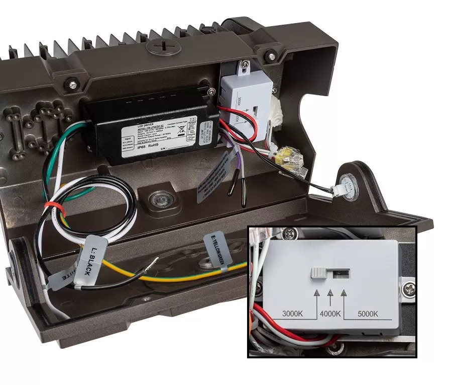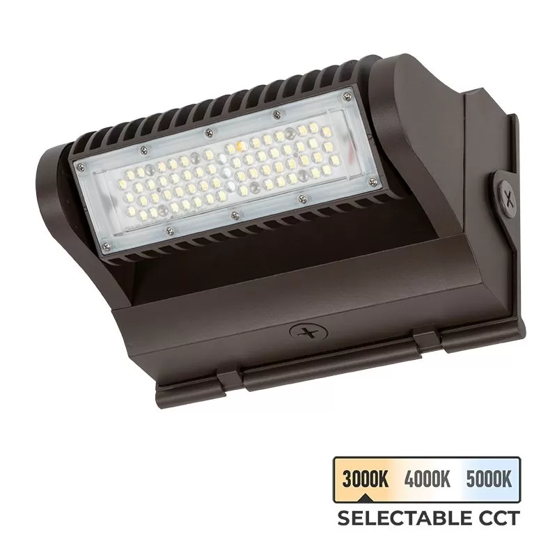 WPRCCT series is an architectural Wall Pack featuring rotatable light head and selectable CCT. Each LED light head rotates a full 360° to illuminate areas at the desired angle. Field selectable CCT allows color temperature to be chosen during installation, tailoring to customer preferences or existing fixtures. Choose from 5000K, 4000K, or nighttime friendly 3000K. Photocell is integrated for automatic dusk to dawn operation (can be bypassed). Die-cast aluminum housing is powder coated and polycarbonate lens is sealed with a silicone gasket, to with stand outdoor conditions. Superior thermal management and high performance LEDs ensure a long lifespan and zero maintenance.