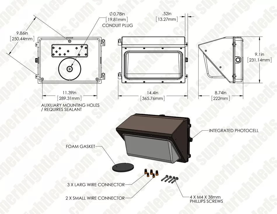 Increase visibility and security with this photocontrol LED wall pack. It emits 2,800 lumens of cool white light, and an integrated dusk-to-dawn photocell allows for effortless operation and energy savings. The 28-watt LED wall pack replaces 70-watt metal-halide (MH) fixtures while lasting at least 3 times longer. Construction consists of a weatherproof die cast aluminum housing with wiring and conduit knockouts and a non-yellowing glass lens. Easily mount the wall pack on a recessed junction box. Installation hardware and a foam mounting pad are included. The LED wall pack operates on 120-277 VAC. It’s great for parking lots, entryways, perimeters, security lighting, and more. Also available with out photocontrol.