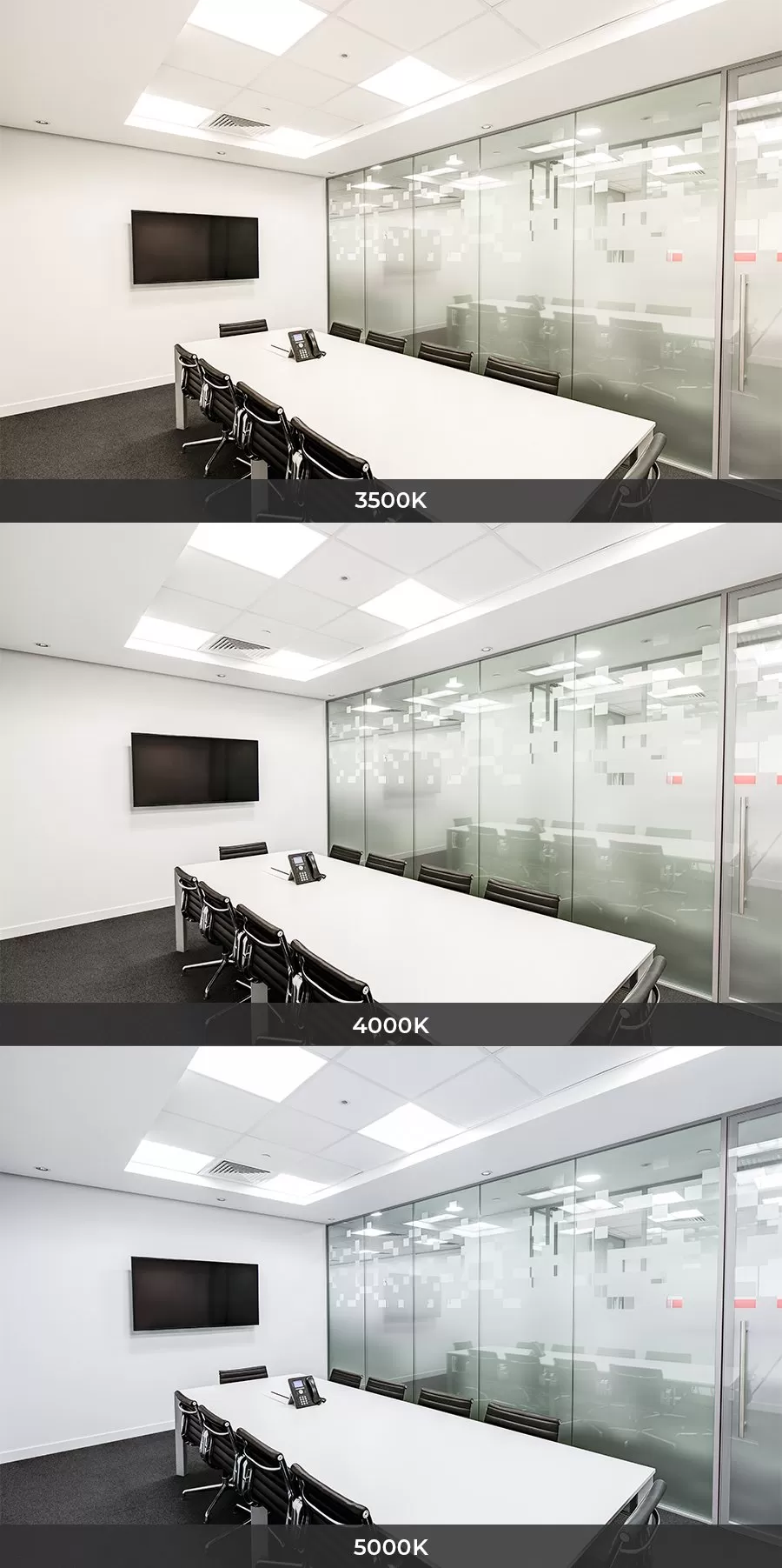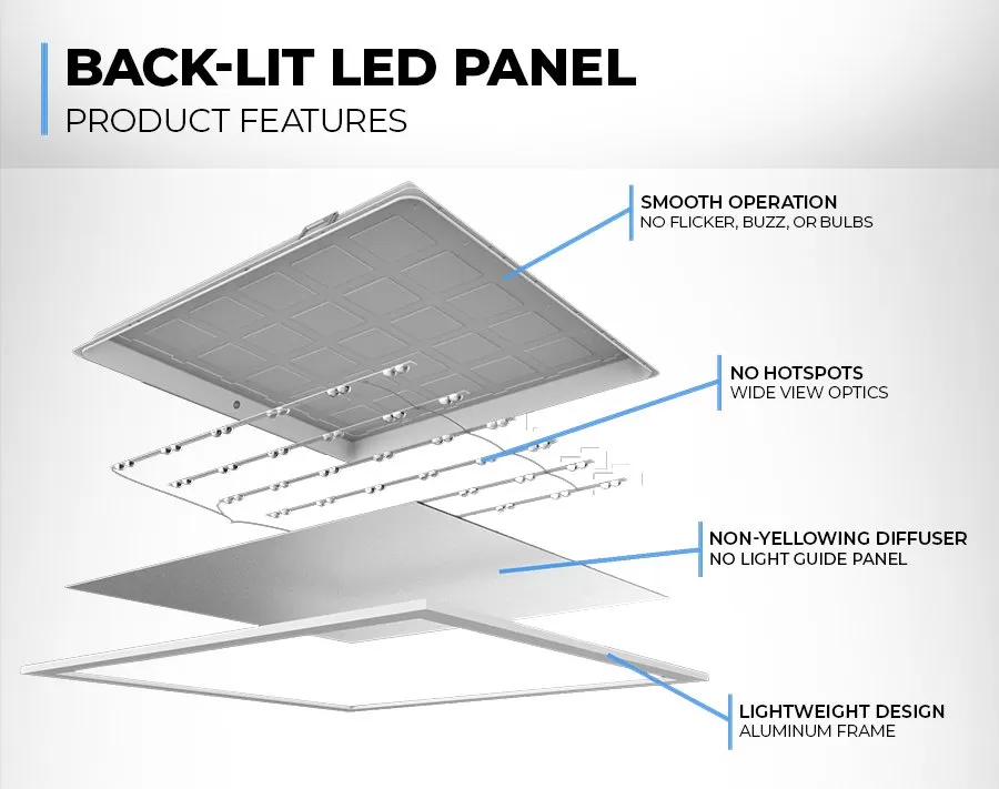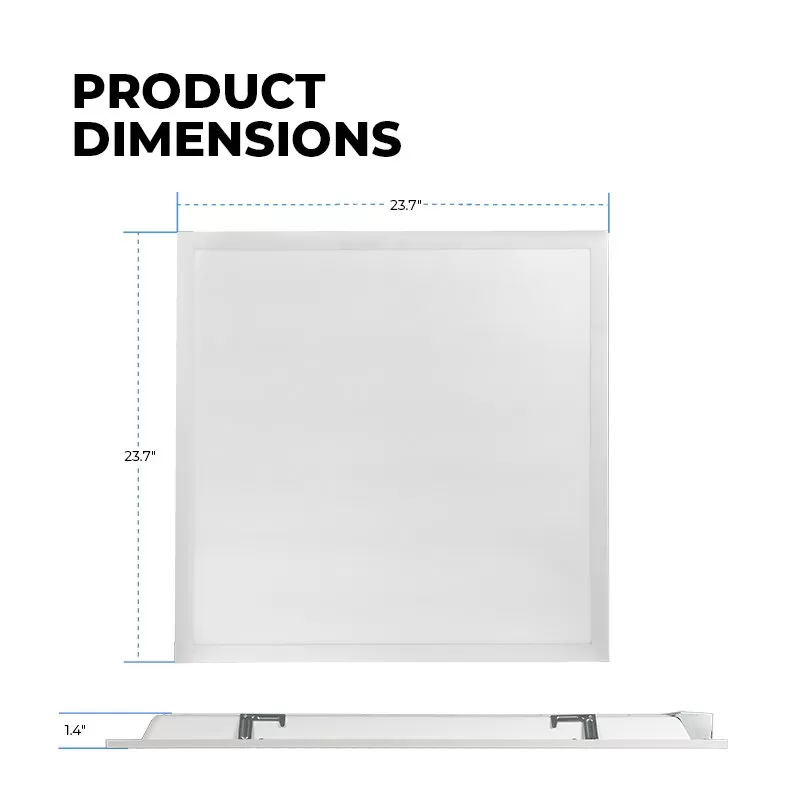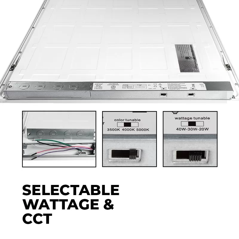 The 2×2 LED flat panel light features selectable CCT and selectable wattage, providing nine fixtures in one. Select the wattage and color temperature for each application setting using the switches on the side of the driver. The white aluminum frame comes with safety tabs on the outside of the fixture to securely install the fixture into standard T-grid drop ceilings. The frosted PMMA lens diffuses the light and creates uniform light distribution free of hotspots. Compatible with a range of optional LED dimmers and a surface mounting kit, all sold separately. Only sold in 2-packs.