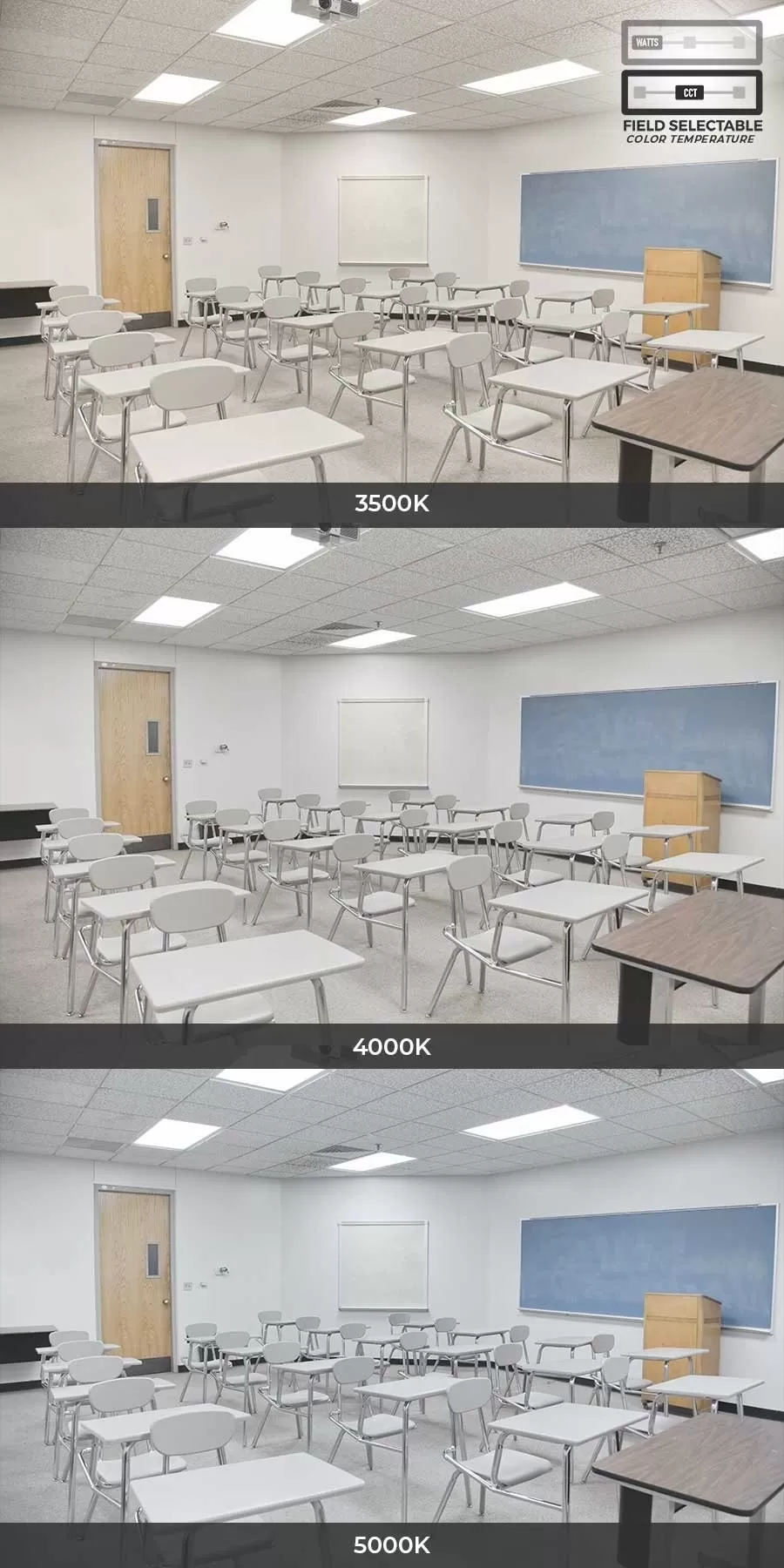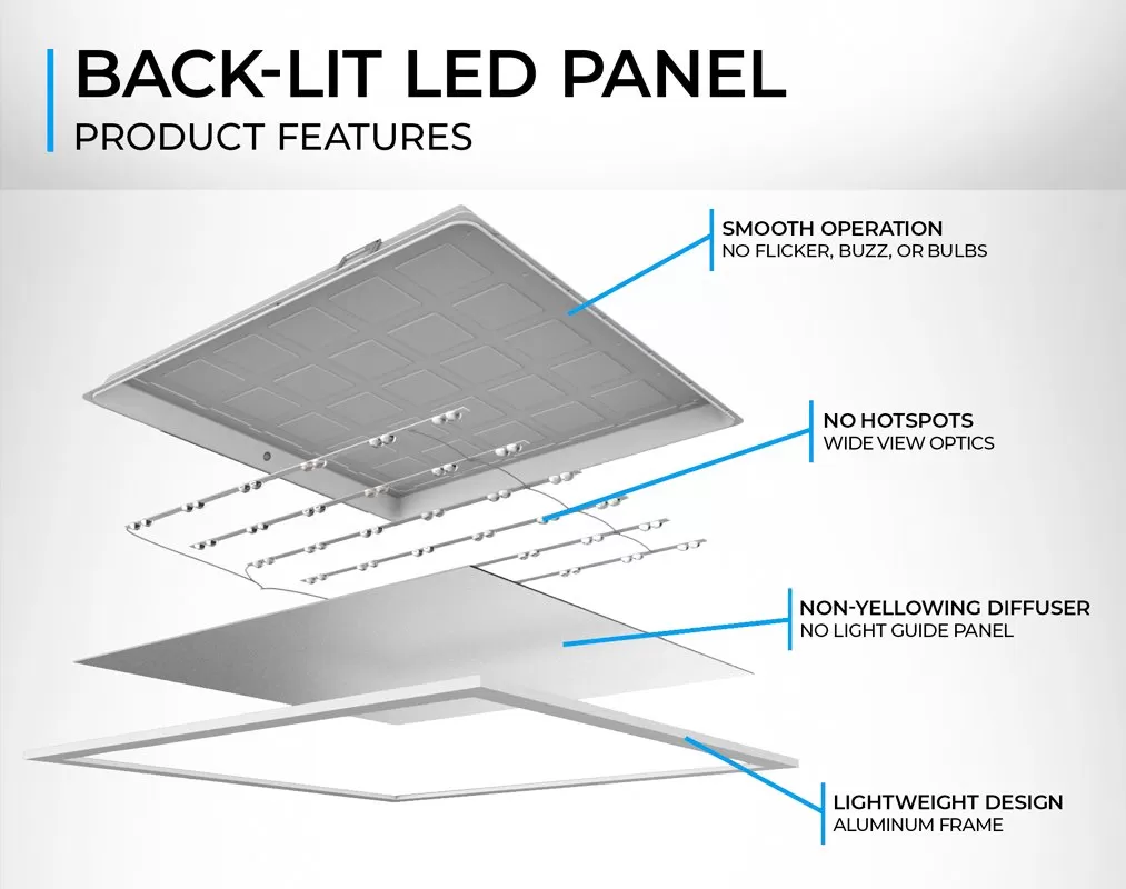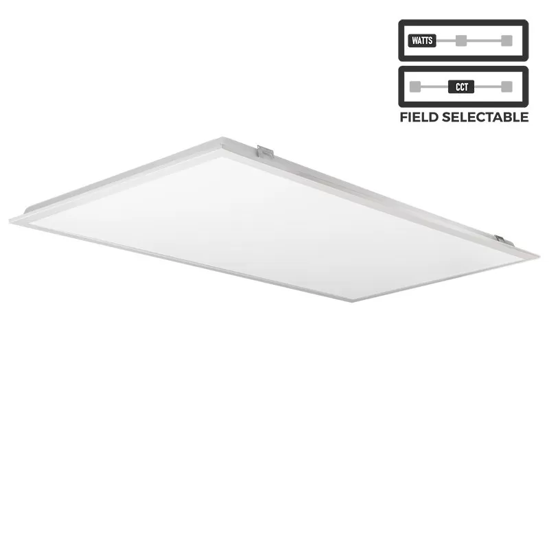 The 2×4 LED Backlit Panel features 3 wattage and 3 color temperature options for customization and versatility during install. Contractors can save on shelf space, reduce inventory costs, and offer a wider selection to customers. The panel is also has a low profile and lightweight design as compared to traditional fluorescent troffers. Use the backlit panel to replace a 3-lamp fluorescent fixture with 32W T8 tubes. The flicker-free, energy-efficient LEDs are evenly diffused through a glare-free frosted lens.