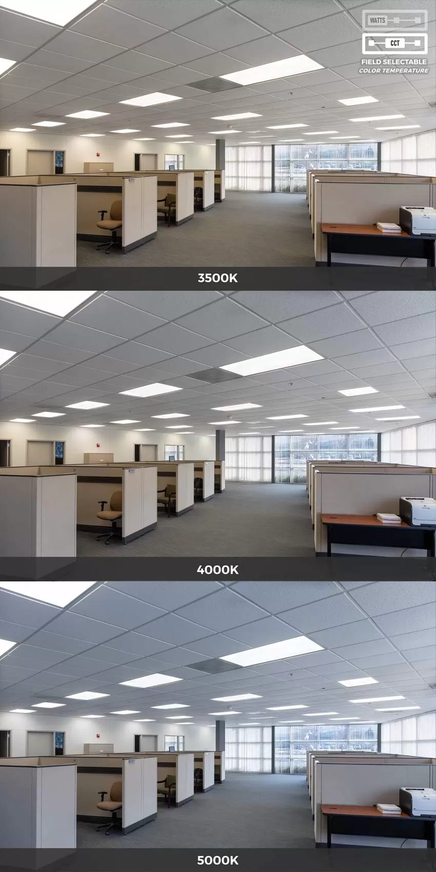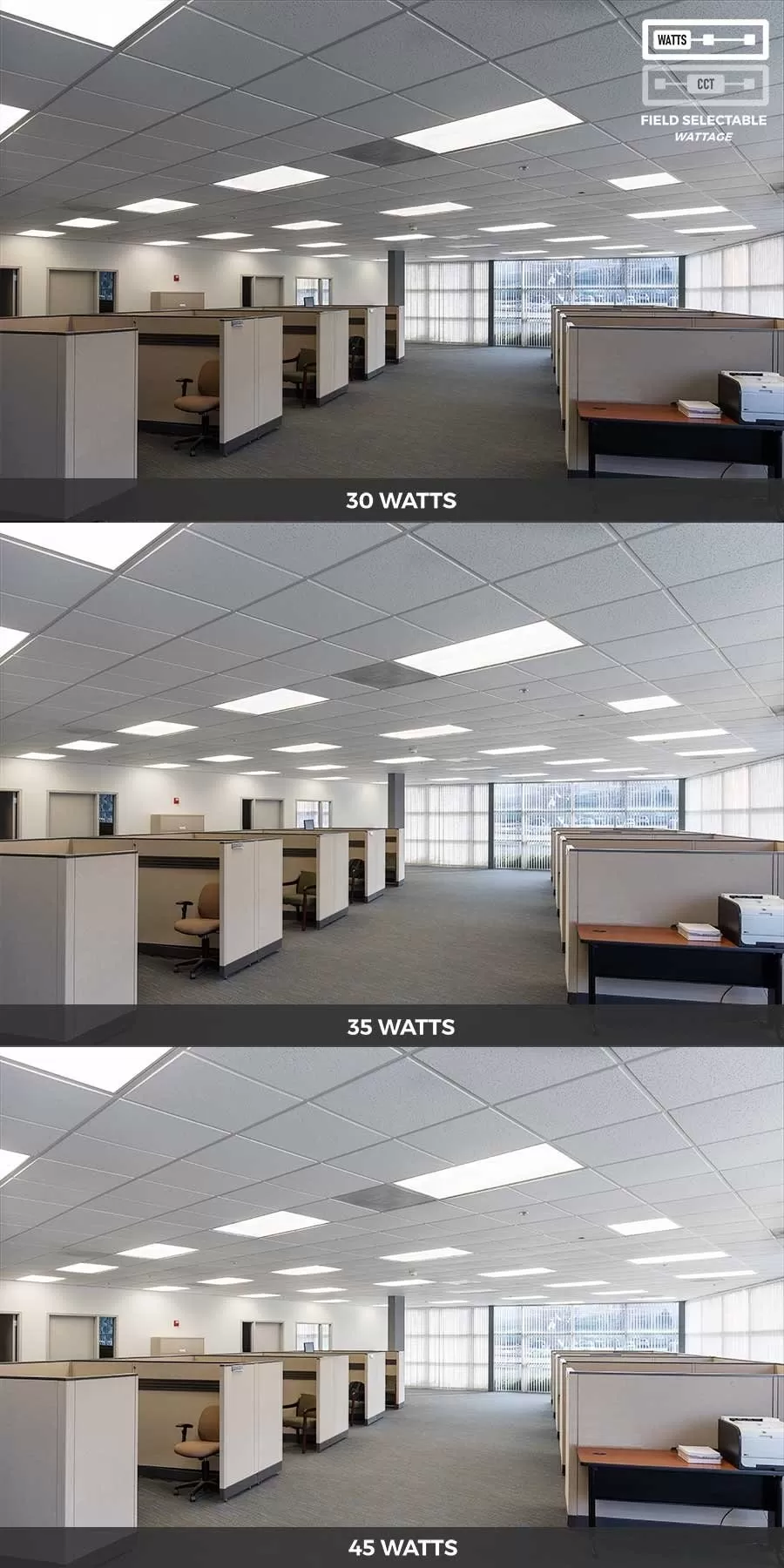 LPD series Field Selectable LED Panel Light allows installers to select light output and color temperature on-site, increasing efficiency while simplifying customer satisfaction. With a slide switch located on the driver, choose between 30, 35, 45-watts, as well as 3500K, 4000K, or 5000K. The ideal solution where preferences vary from space to space, this single fixture can be used throughout schools, businesses, hospitals, and more. Replace flickering fluorescent troffers with smooth and glare-free illumination of edge-lit LEDs. Acrylic Even-Glow® light guide panel will resist yellowing over time while diffusing uniform, ambient light. Durable yet lightweight die-cast aluminum frame will fit shallow plenum spaces often found in suspended drop ceilings.