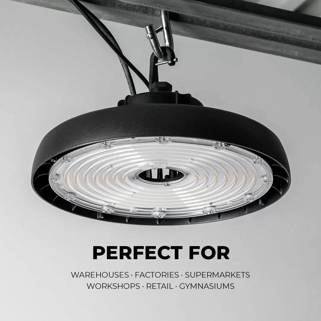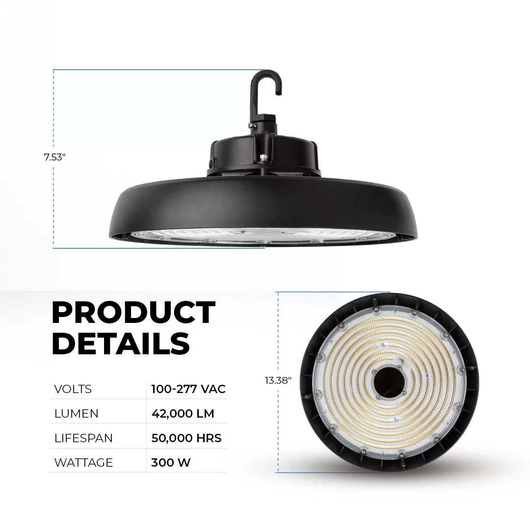 This LED UFO high bay light was designed to replace a 1000W metal halide fixture. The low-profile is constructed with powder-coated aluminum and an included polycarbonate reflector for uniform light distribution. Rated IP65, the high bay resists corrosion and moisture. Install with the included mounting hook and safety cable. Ideal for commercial applications such as warehouses, gymnasiums, and factories.
