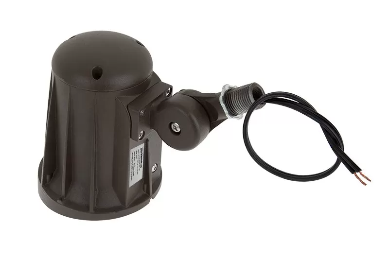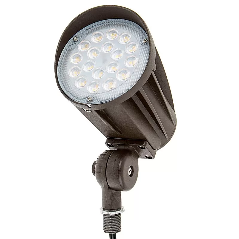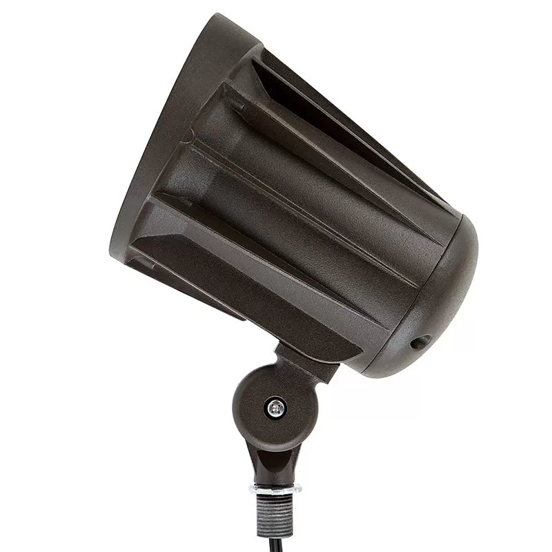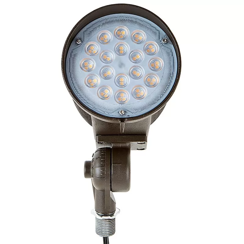 The 30W knuckle-mount LED bullet-style spot light delivers a 60° flood light beam angle. It features a 6×6 NEMA beam distribution pattern for commercial exterior lighting and signage lighting. The light fixture replaces 70W metal halide fixtures and lowers maintenance costs while improving energy-efficiency. The heavy-duty bronze die-cast aluminum housing with a polycarbonate lens is impact-resistant and withstands weather conditions. Mounts directly into junction boxes with ½” NPT threaded knuckle. Also available in a 20-watt version.
