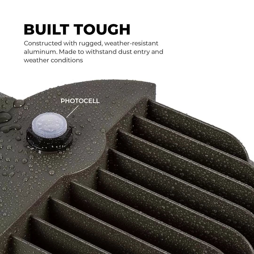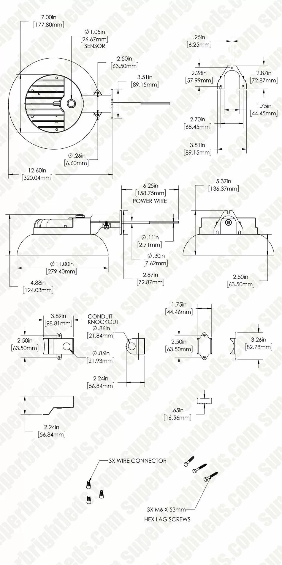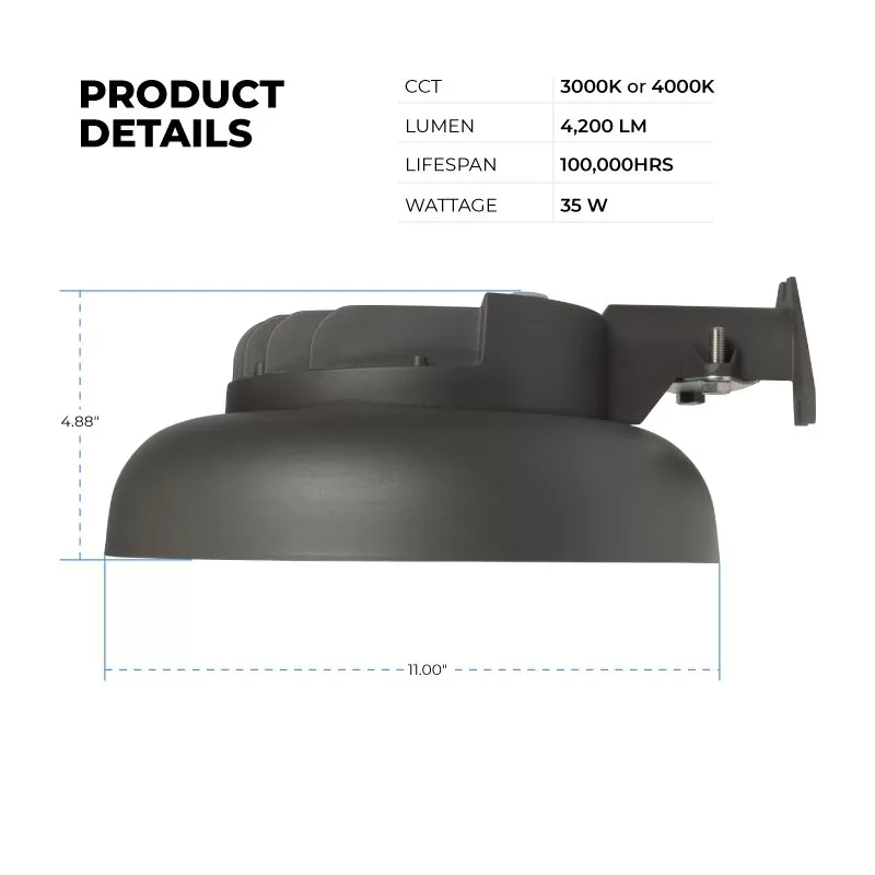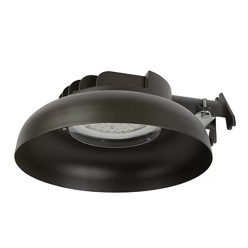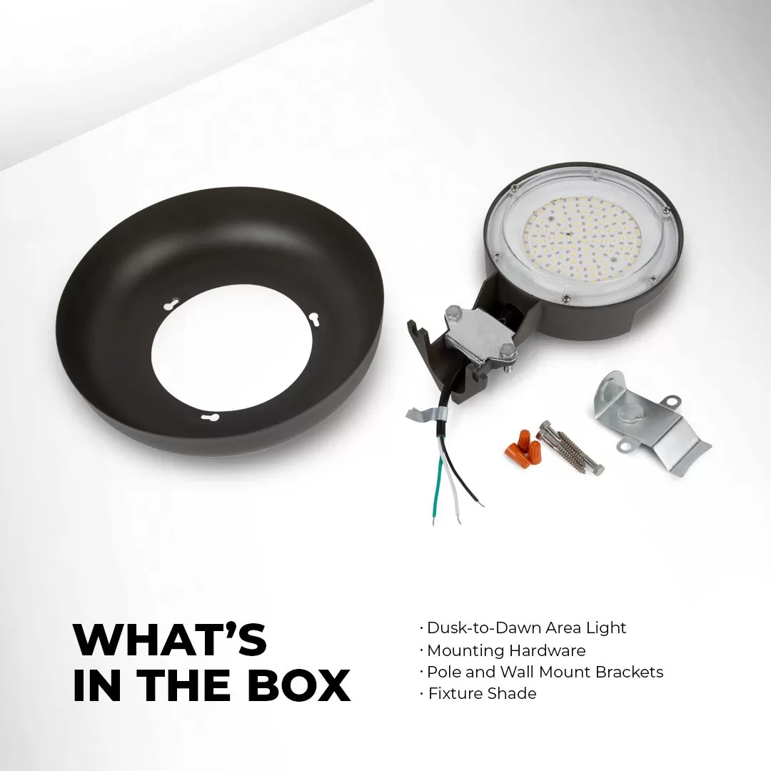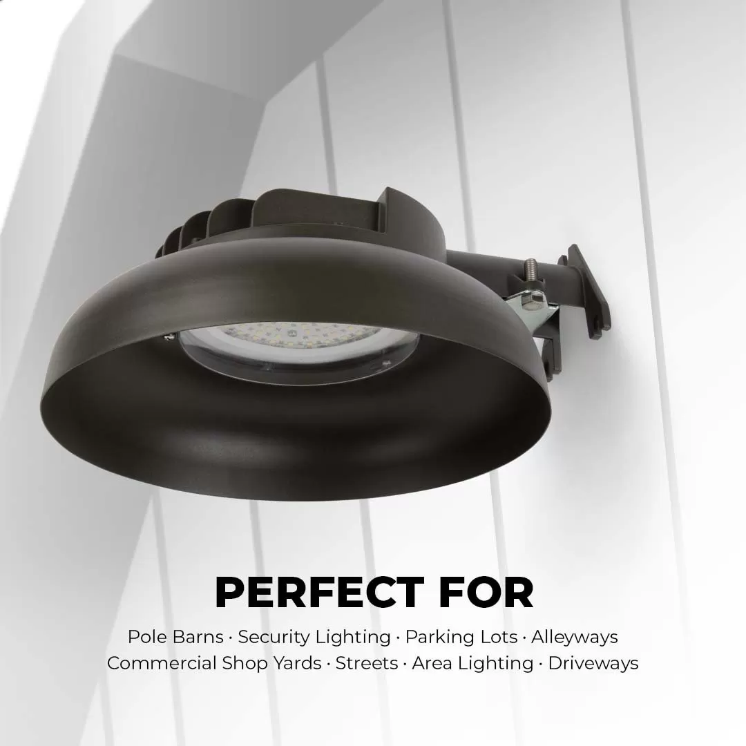 The 35W dusk to dawn LED area light features an integrated photocell and efficiently produces 4,200 lumens, equivalent to a 100W metal halide. A modern take on traditional barn light fixtures, a round lampshade reduces glare and delivers a wide NEMA 6×6 beam pattern. Construction is durable, coated aluminum with a clear polycarbonate lens. Use the included hardware for surface mounting or pole mount via the optional mounting arm (see accessories).