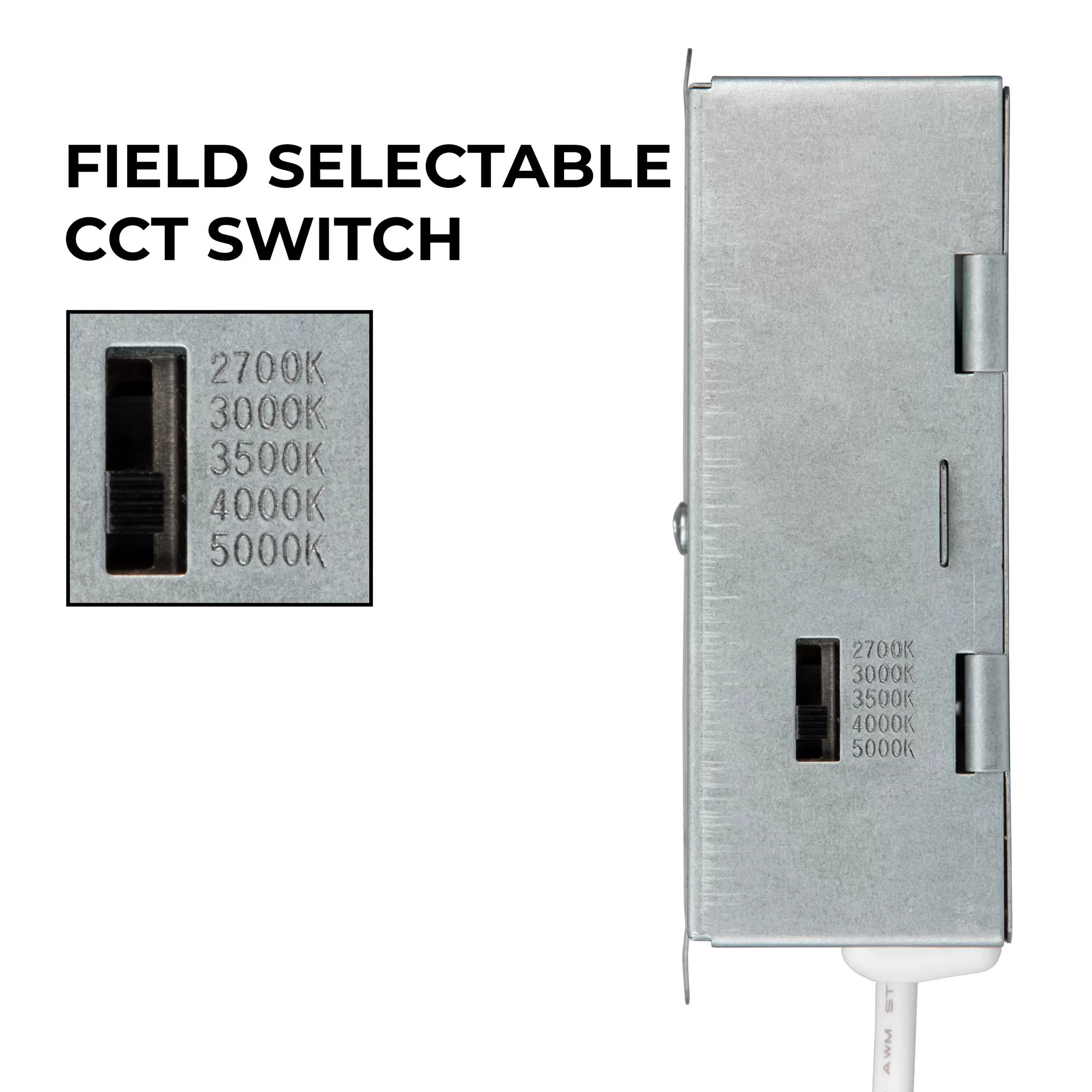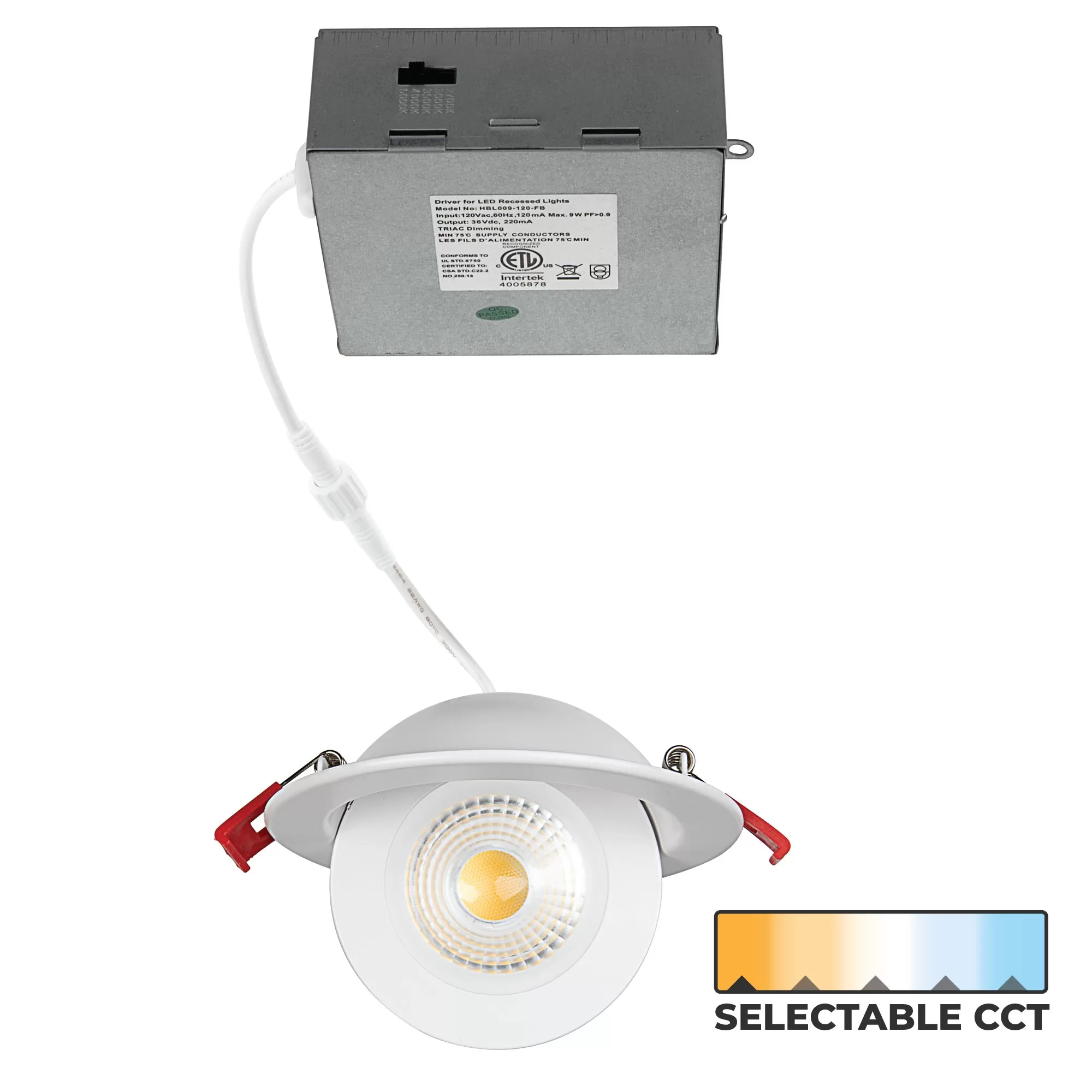 The 4-inch LED gimbal downlight has a round floating gimbal with an 80-degree tilt adjustment for precision lighting. This canless recessed downlight is TRIAC dimmable and has a 38-degree focused beam delivering 810 lumens with a 90+ CRI for accurate color rendering. Use the switch on the driver box to set the selectable CCT to match 2700K, 3000K, 3500K, 4000K, or 5000K during installation. The fixture has spring clips for mounting without a can housing and includes a remote driver box for installation in ceilings as shallow as two inches. This air-tight IC Rated downlight is well-suited for residential and commercial ceiling lighting. They are ideal for new construction, renovations, and remodeling for kitchens, bathrooms, living rooms, basements, office lighting, and other indoor applications.