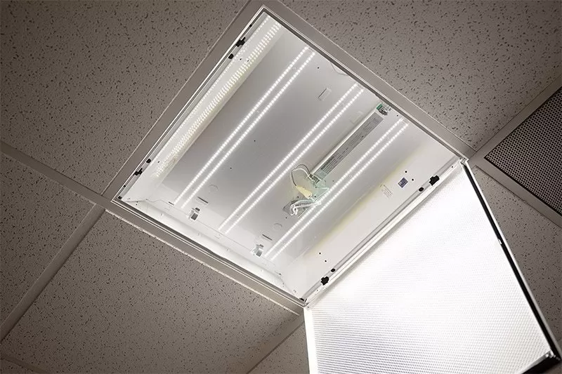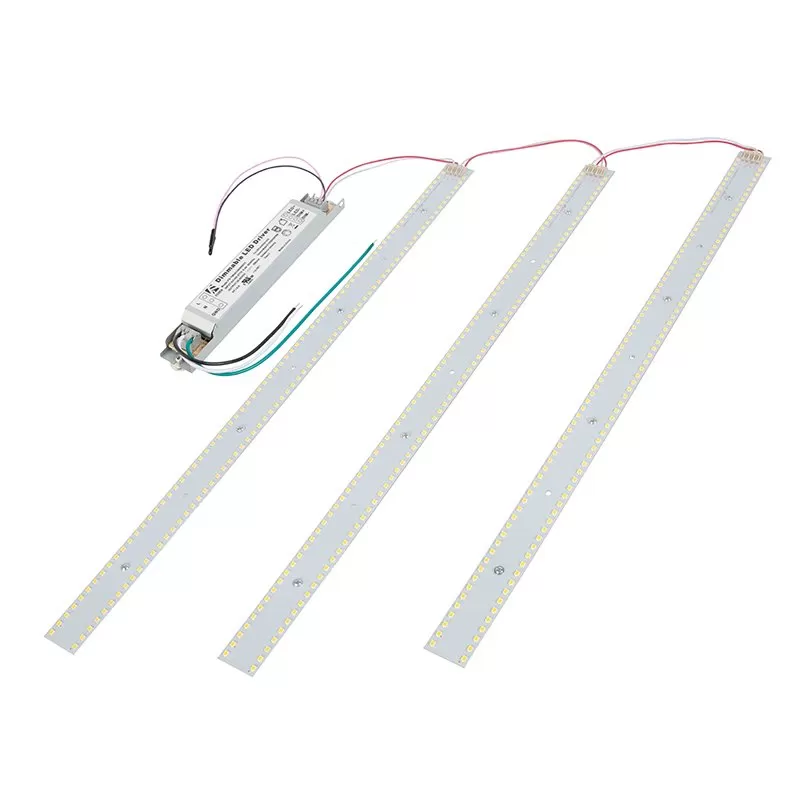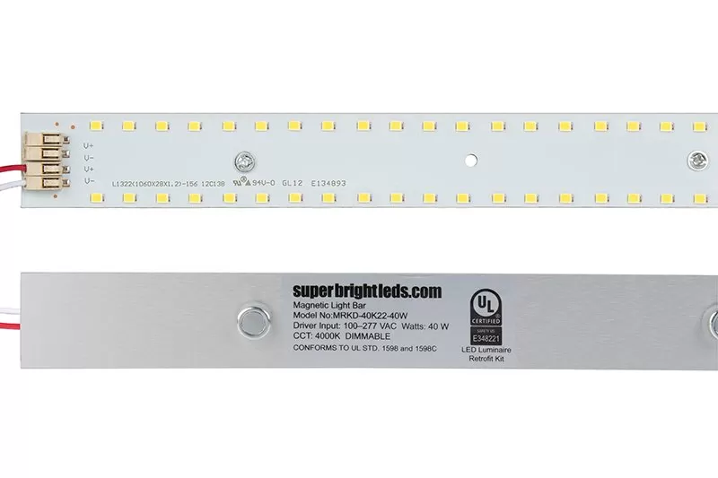 This dimmable LED magnetic strip retrofit kit is designed to replace the ballast and tubes in 2′ x 2′ fluorescent troffers. Bright and powerful—the 40-watt LED retrofit kit emits up to 5200 lumens of warm, natural, or cool white light—equivalent to the output of 4 17-watt fluorescent T8 tubes. They’re designed to last 5 times longer than fluorescent lights. The LED lights have magnets every 5” for secure mounting, and they operate on 100-277 VAC. A 0-10V dimmable constant-current driver is included, and brightness can be controlled with a 0-10V dimmer. This LED magnetic retrofit kit is perfect for homes, offices, schools, hospitals, and more!