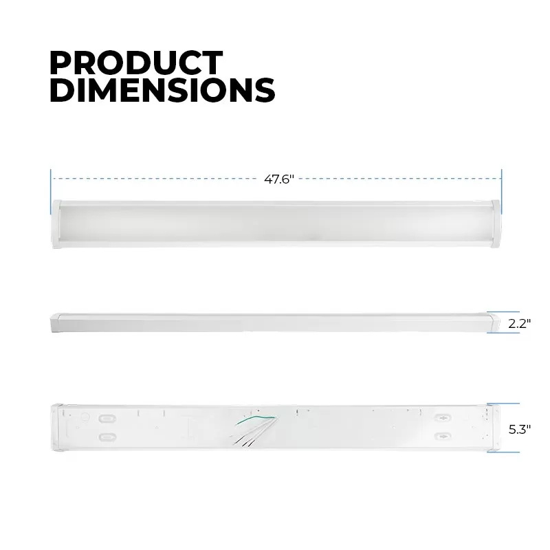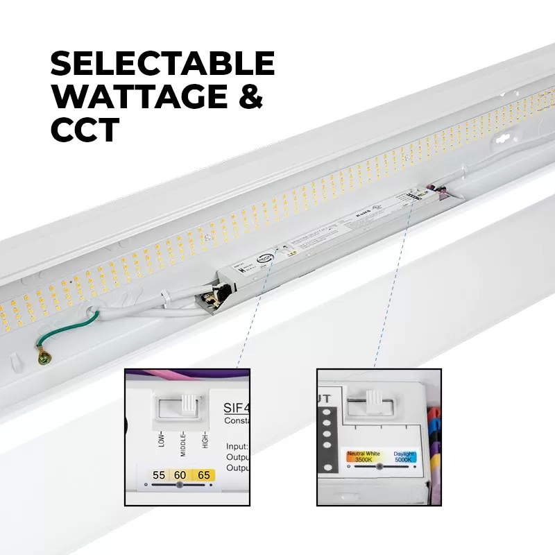 Replace outdated fluorescent wraparound lights using the 4ft LED wraparound light fixture. The field-selectable wattage can replace fluorescent fixtures using up-to three 4-foot 32W T8 tubes. Using the switches on the internal driver, select the desired wattage and color temperature for the application setting. A curved PMMA lens diffuses the light beam creating 110° of even and glare-free light. Surface mount the fixture to a junction box. Ideal for commercial and residential applications such as offices, schools, and workshops.