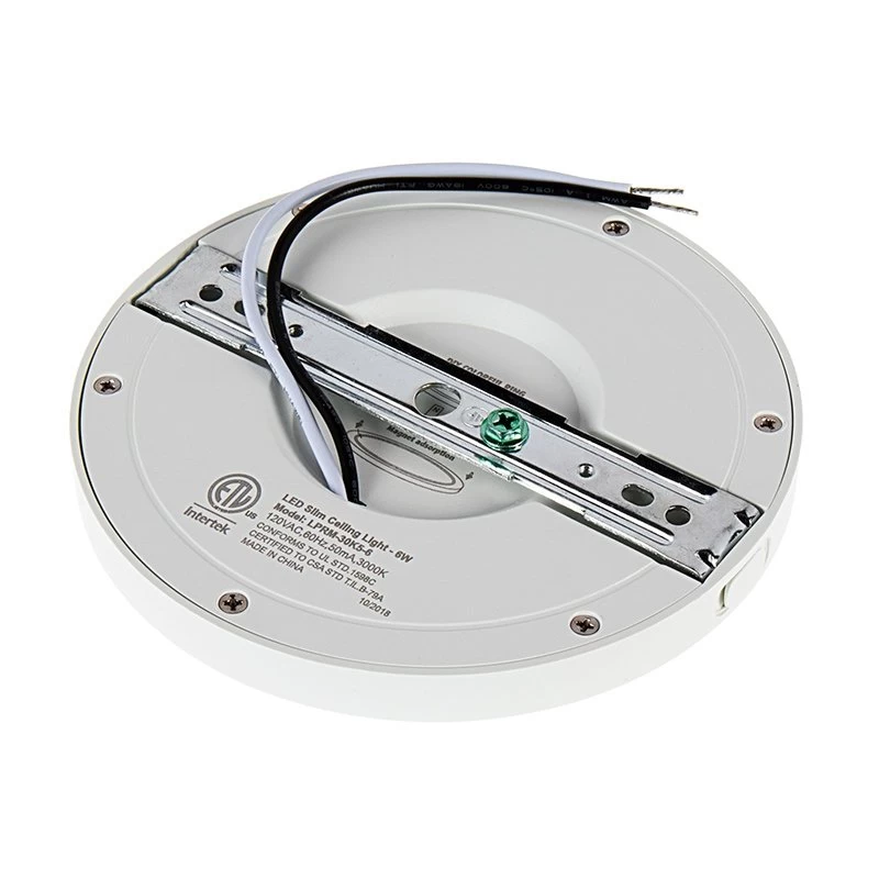The low-profile dimmable 5″ downlight features a magnetic base with removable chrome trim. The light is customizable with optional trim rings to match your decor. Equivalent to 50W incandescent fixtures, it is ideal for new construction, remodeling, and retrofit applications. At 6W, the downlight delivers 360 lumens and is well-suited to kitchen, living room, or office use. The included bracket and hardware flush mount directly to a junction box.