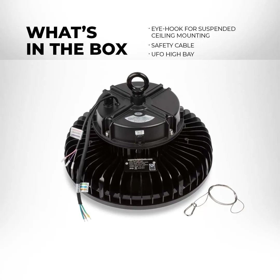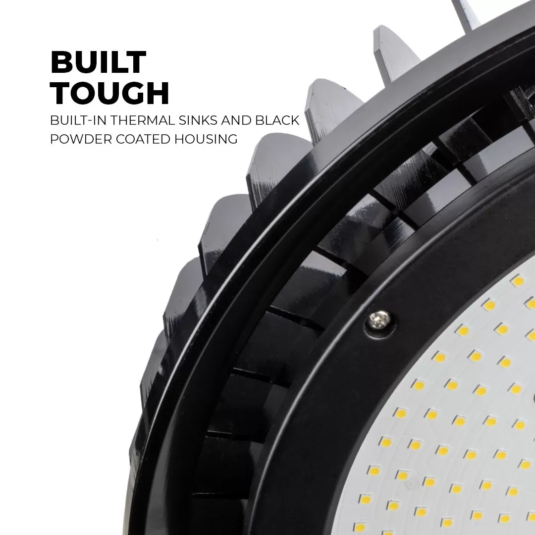 The round LED high bay is designed to lower maintenance costs by replacing traditional metal halide fixtures. The high bay is constructed with a powder-coated aluminum housing and polycarbonate lens for durability. The waterproof IP65 rating allows the fixture to withstand outdoor weather conditions. Use the compatible diffusing lens to narrow the beam angle (sold separately).