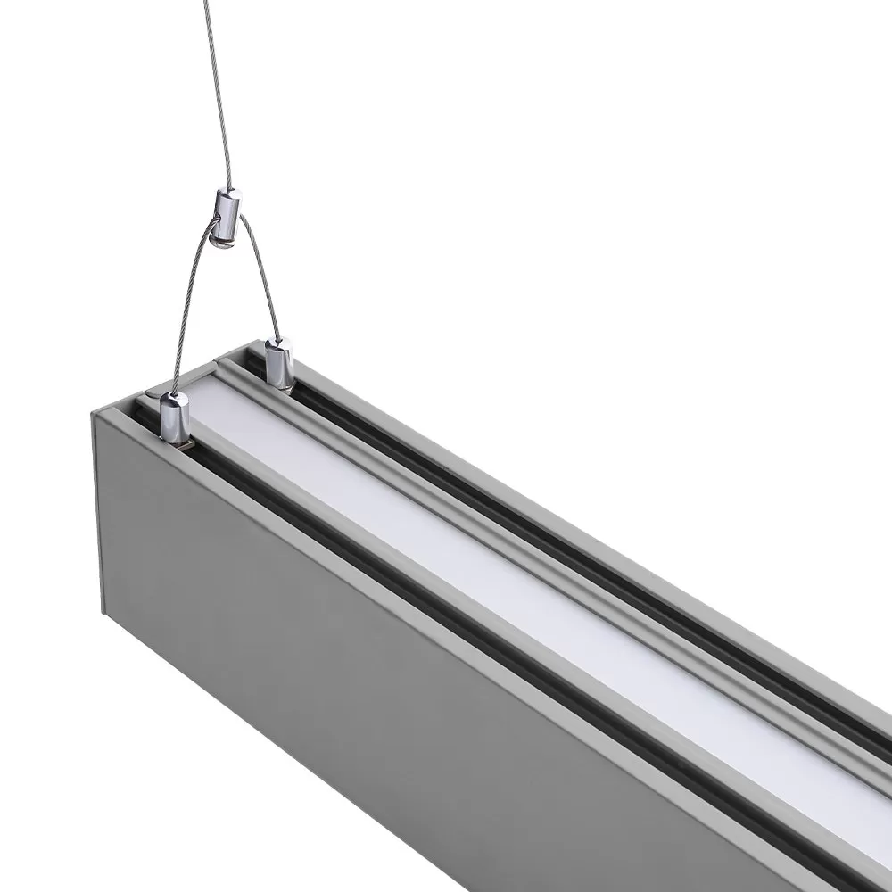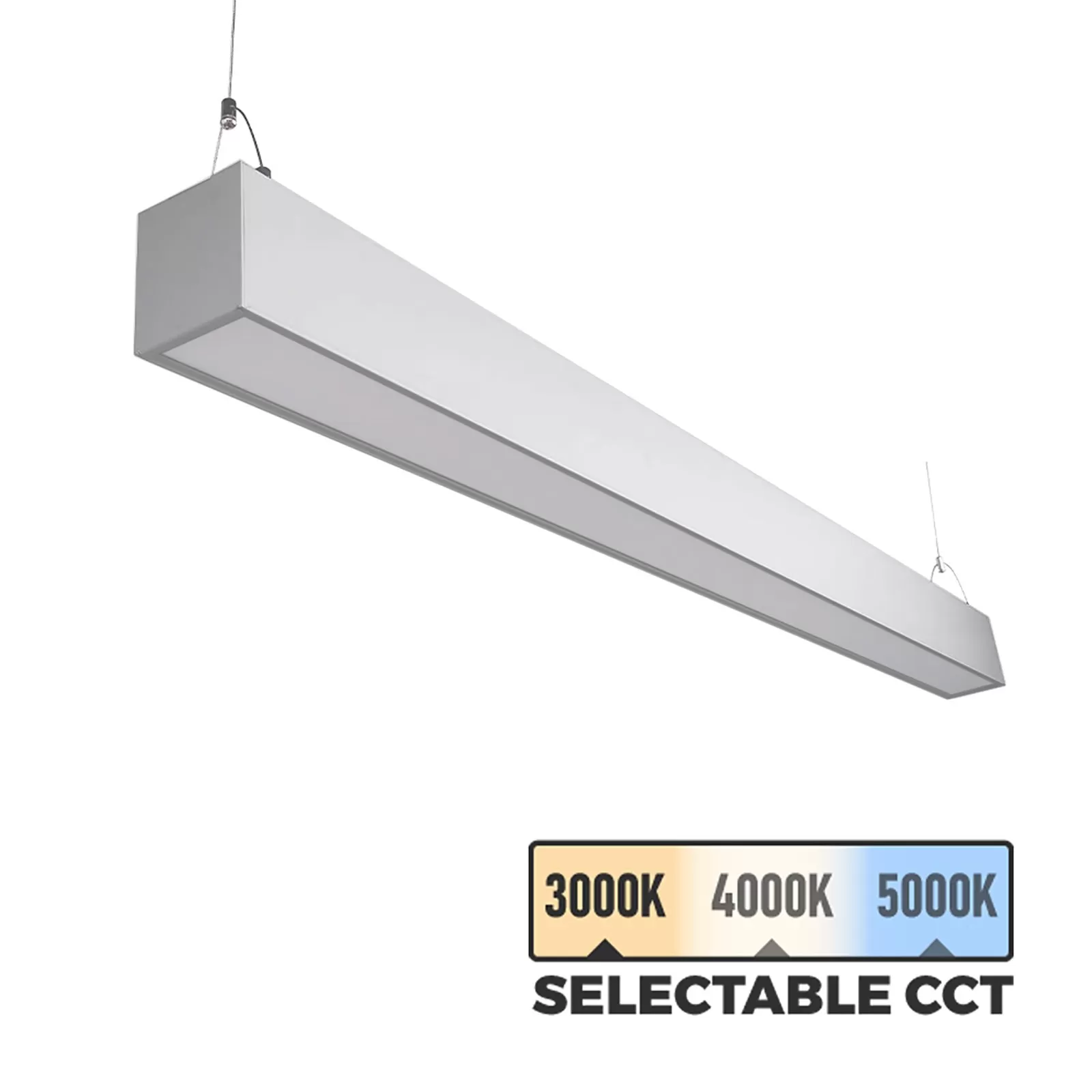 Thie 50W LED Linear Fixture from Euri Lighting is an architectural suspension light perfect for commercial spaces such as office buildings and healthcare facilities. This light features selectable CCT and has dual independent switches, meaning the color temperature of the up lighting and the down lighting can be separate. The fixture distributes 70% of total light output downward and the remaining 30% upwards. Link up to 7 light fixtures together. Mount using the included suspension hanging kit.