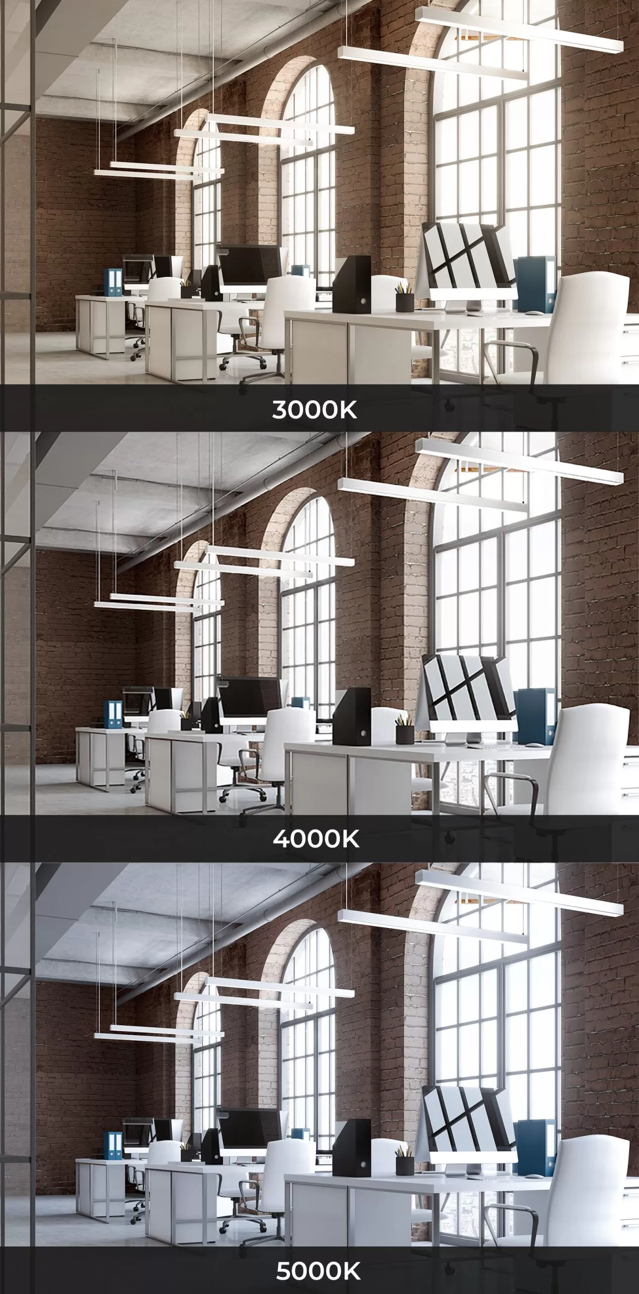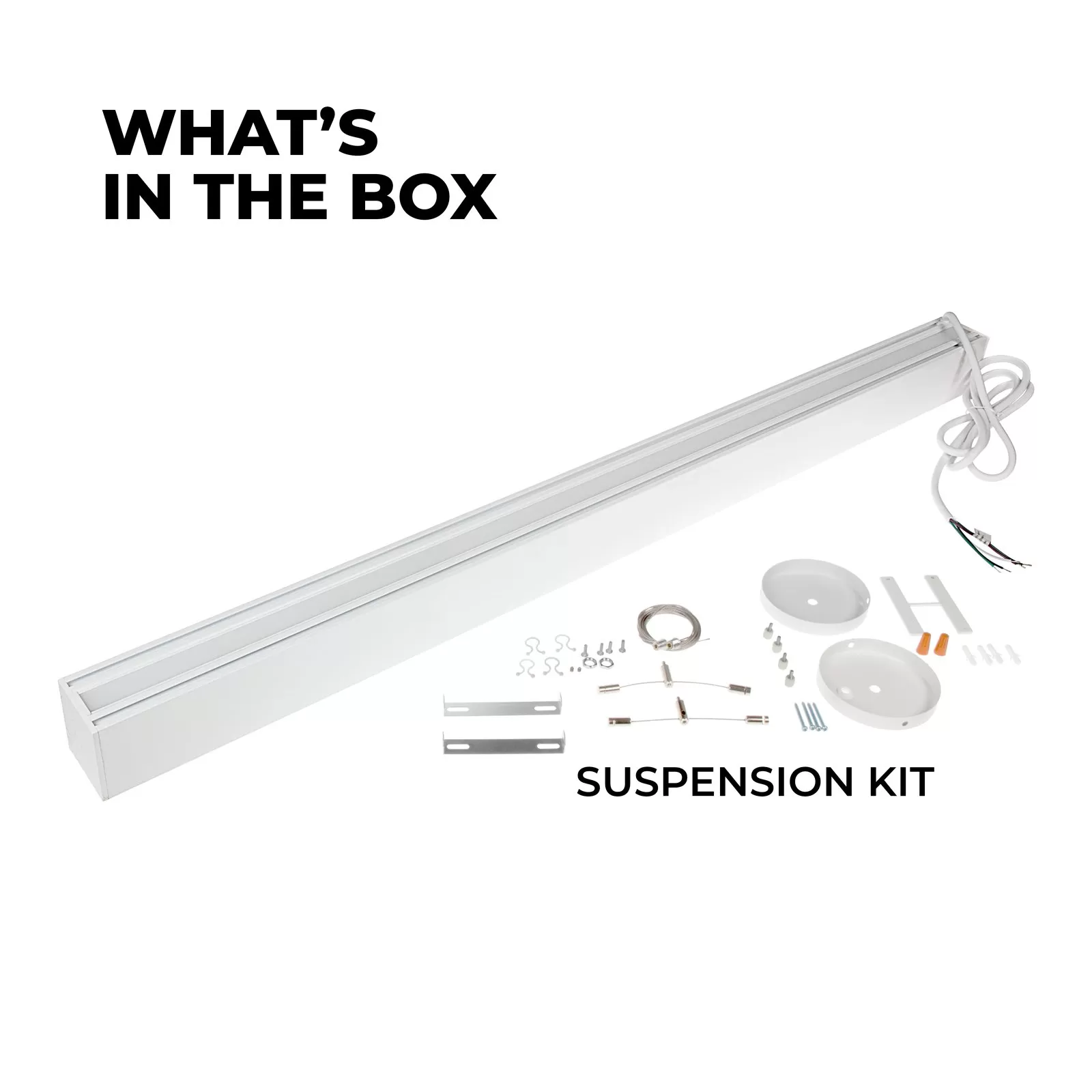Thie 50W LED Linear Fixture from Euri Lighting is an architectural suspension light perfect for commercial spaces such as office buildings and healthcare facilities. This light features selectable CCT and has dual independent switches, meaning the color temperature of the up lighting and the down lighting can be separate. The fixture distributes 70% of total light output downward and the remaining 30% upwards. Link up to 7 light fixtures together. Mount using the included suspension hanging kit.