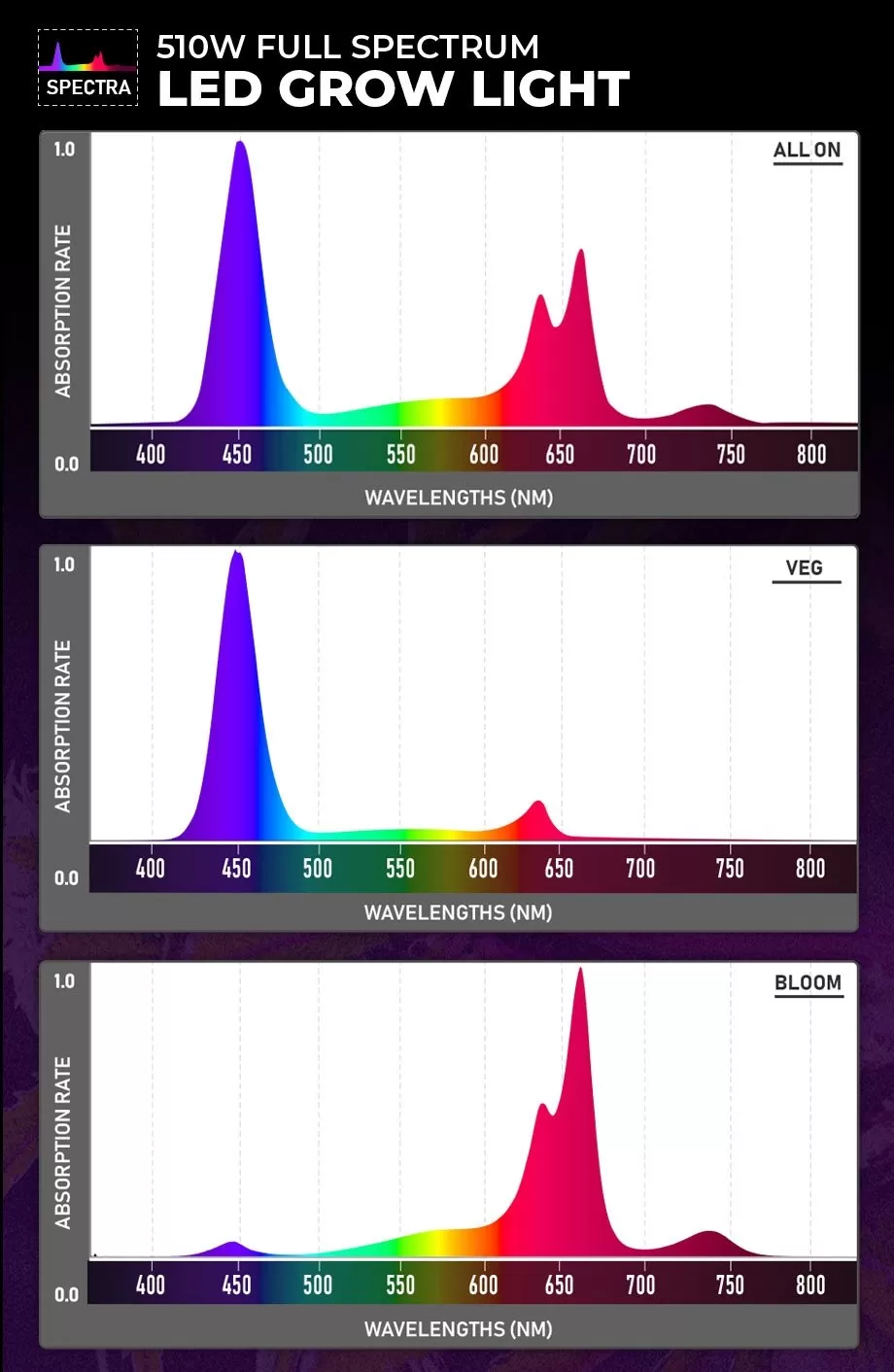 Grow better yields and higher quality plants with GLR series 510W Grow Light. 12-band Full Spectrum LEDs and selectable VEG and BLOOM can support a variety of plants through all stages of growth. Constructed with steel housing and integrated cooling fans, horticulture light with stands moisture and seamlessly ventilates heat. Remove the hassle of harmful pesticides, bugs, outside fans, and bulb replacement by installing this versatile fixture. Hang it with included hardware in any greenhouse, tent, or grow room, and adjust height as plants mature. Optics are designed to maximize canopy coverage and improve conditions for photosynthesis. with higher energy efficiency and light control, this linkable LED fixture replaces up to 1200W HID while improving visibility for users assessing growth.