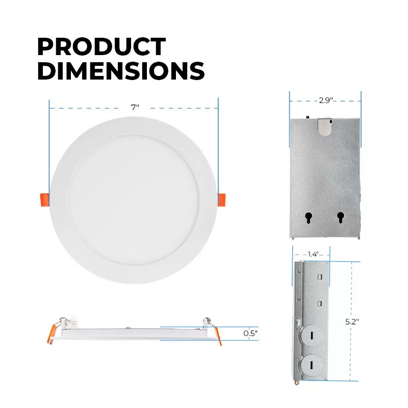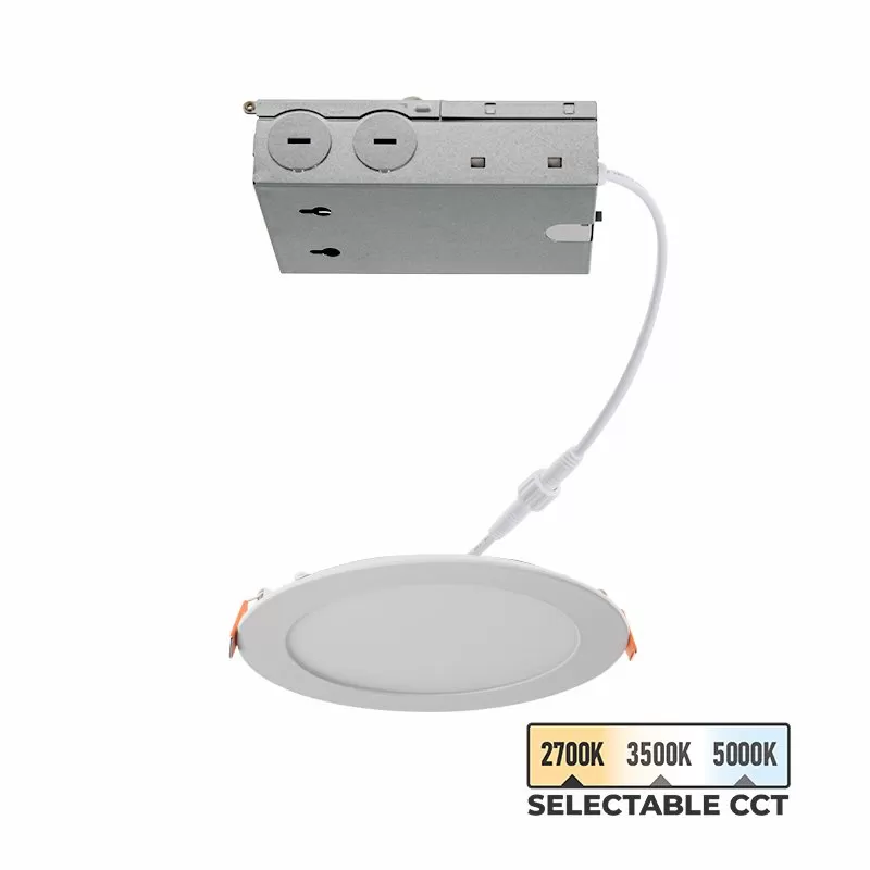 The 6″ 12W ultra-thin recessed downlight is a complete canless LED lighting solution with selectable CCT. The light is designed for new construction, remodeling, and retrofit installation without a can light housing or junction box. A slim profile and independent junction box with a dimmable driver allow installation in any ceiling with limited vertical clearance, such as a cathedral or vaulted ceiling. Select the color temperature with a simple switch on the driver for various applications with up to 984 lumens. Warm white light creates a relaxed atmosphere for living rooms, dens, or entertainment spaces. Cool white light helps maintain a more alert environment ideal for offices, schools, or kitchens.