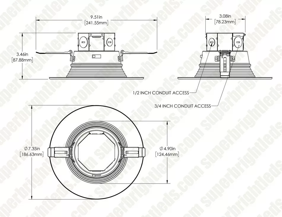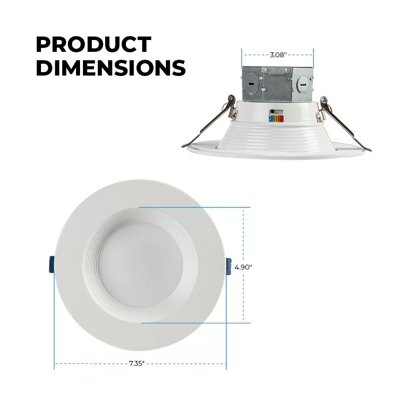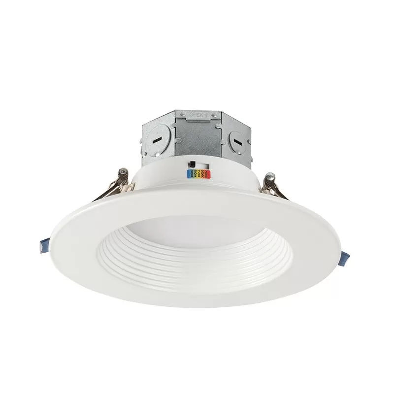 The LED recessed downlight features selectable CCT and a built-in junction box. During installation, choose the desired color temperature from 2700K, 3000K, 3500K, 4000K, or 5000K using the switch on the downlight. The IP44 rating ensures the downlight can be used in damp areas such as bathrooms, and kitchens. Round and square knockouts can be used for conduit or non-metallic sheathed cables. The versatile downlight produces exceptional color rendering and has TRIAC dimming adjustment. Ideal for residential and commercial applications in offices, dens, and bathrooms.