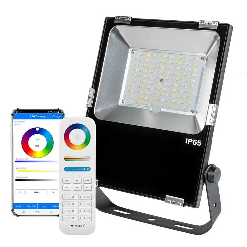 FL-RGBCCT series LED Flood Light has wireless control options to bring convenient, tunable light to both outdoor landscapes and indoor venues. with a wide 120° beam angle, integrated RGB+Tunable White LEDs create the full spectrum of colors and whites. Select from the many dynamic patterns and single color choices, as well as adjust brightness, chase speed, and more. Control with a compatible RF remote, or pair with the MiBoxer WiFi Hub and app to control from a smart device. Durable build will withstand extreme weather conditions and commercial application, while sleek design will compliment event spaces or other decorative environments.