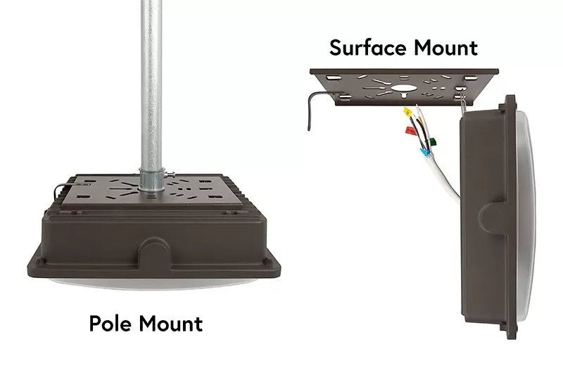 The LED Parking Garage Canopy lights feature a durable, slim design. Easily surface mount or pendant mount the fixture using the 3/4” NPT conduit entry point. Bronze aluminum housing, polycarbonate lens, and weatherproof IP65 rating withstand outdoor conditions. Ideal for parking garages, gas stations, and outdoor commercial applications.