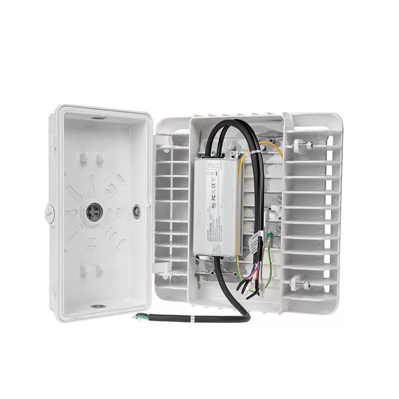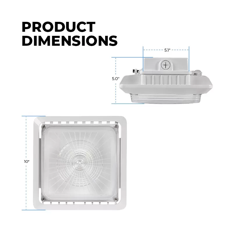 The 75W LED Parking Garage Canopy Light replaces up to 250W metal halide fixtures, lowering maintenance and energy costs. The fixture is constructed of a durable aluminum housing and a polycarbonate lens. The light is suitable for wet locations with the IP65 waterproof rating. Surface mount using the 1/2“ conduit entry points on the side and pendant mount using the 3/4“ conduit entry point on the top. Install in parking garages, covered walkways, and stairwells.