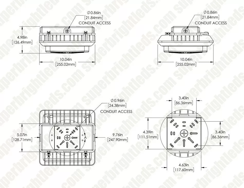 - Surface mount using the 1/2“ conduit entry points on the side; pendant mount using the 3/4“ conduit entry point on the top