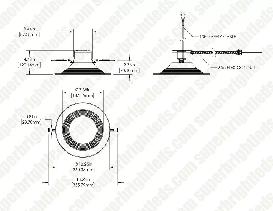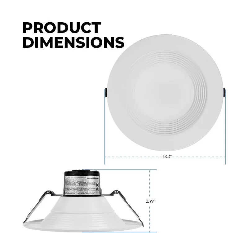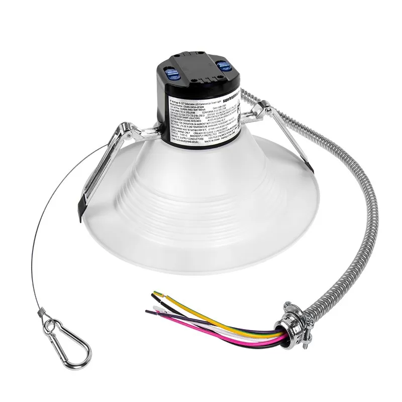 The 8″ LED commercial recessed downlight is a versatile lighting solution for commercial and residential spaces. The fixture has two slide switches; one selects from five CCT options and one from three wattage options. These variable switches give you the functionality of 15 lights in one with the flexibility to customize light color and output. Spring clips allow for easy installation in commercial downlight frames. A steel cable with a carabiner provides added safety. The deep recessed light source has a frosted lens to create smooth, glare-free illumination. White aluminum trim gives a clean finish that complements various interior spaces. The light includes a flexible electrical wire whip and twist-on wire connectors for installation. Ideal for use in new construction, remodeling, and retrofit projects. It fits an 8″ diameter recess. Available in four sizes: 4″, 6″, 8″, and 10″