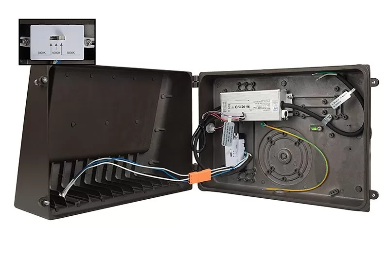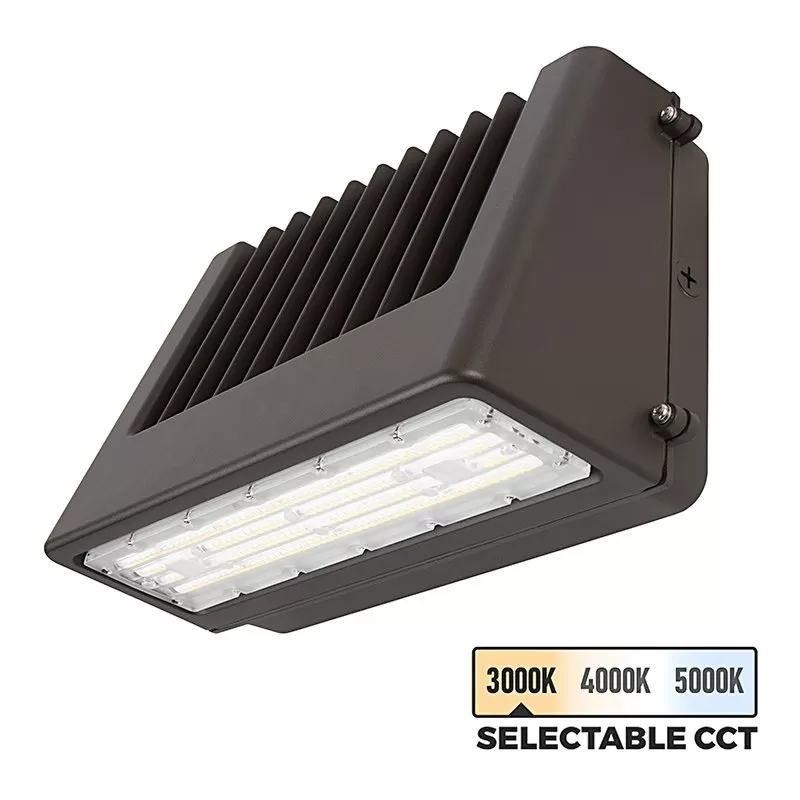 WPFCCT series LED Wall Pack is an architectural luminaire with full cutoff design and field-selectable CCT. The internal slide switch allows users to select color temperature during installation, to match client preferences or existing lighting. Choose 5000K, 4000K, or nighttime friendly 3000K. The full cutoff form factor maximizes light distribution and application spacing, while eliminating uplight. Photocell is integrated for dusk to dawn operation (can be bypassed). Maintains a similar footprint to traditional MH or HID wall packs for easy replacement. Construction is durable yet lightweight, with a trapezoid-shaped powder coated housing and sealed polycarbonate lens.
