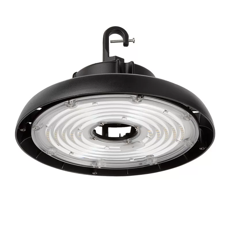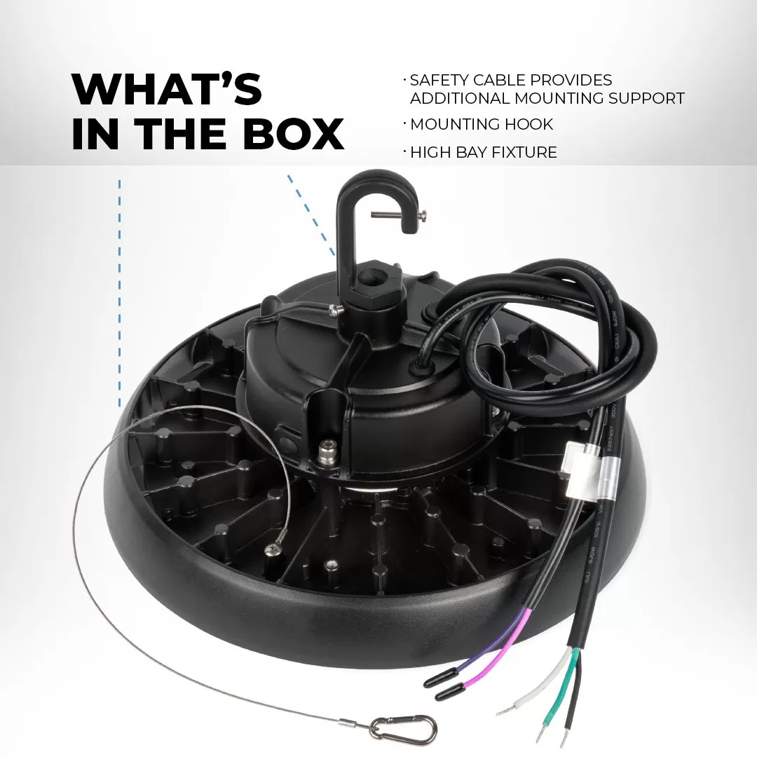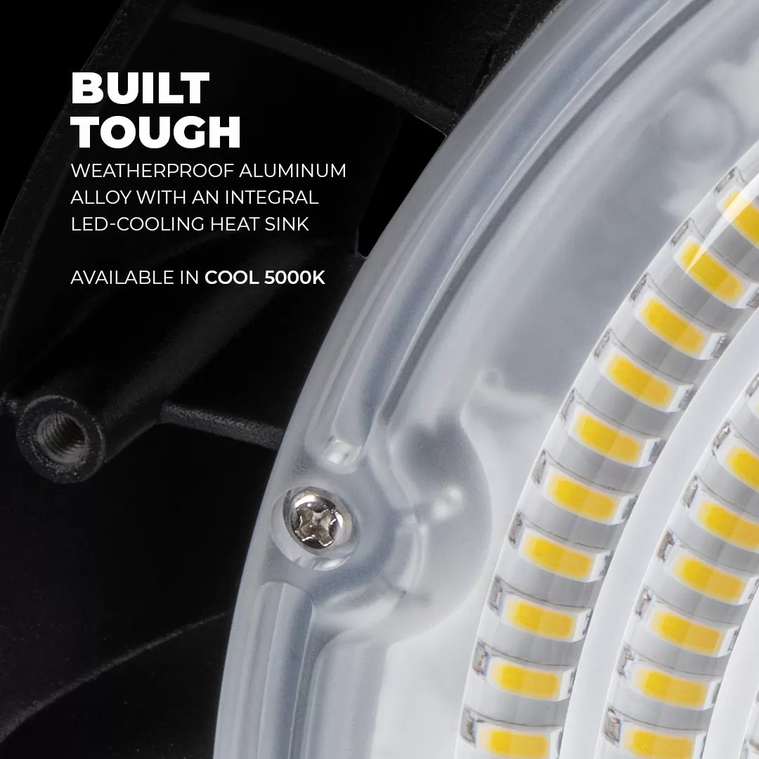 This LED UFO high bay light was designed to replace a 175W metal halide fixture. The low-profile is constructed with powder-coated aluminum and a polycarbonate lens for uniform light distribution. Rated IP65, the high bay resists corrosion and moisture. Install with the included mounting hook and safety cable. Compatible with an optional reflector. Ideal for commercial applications such as warehouses, gymnasiums, and factories.
