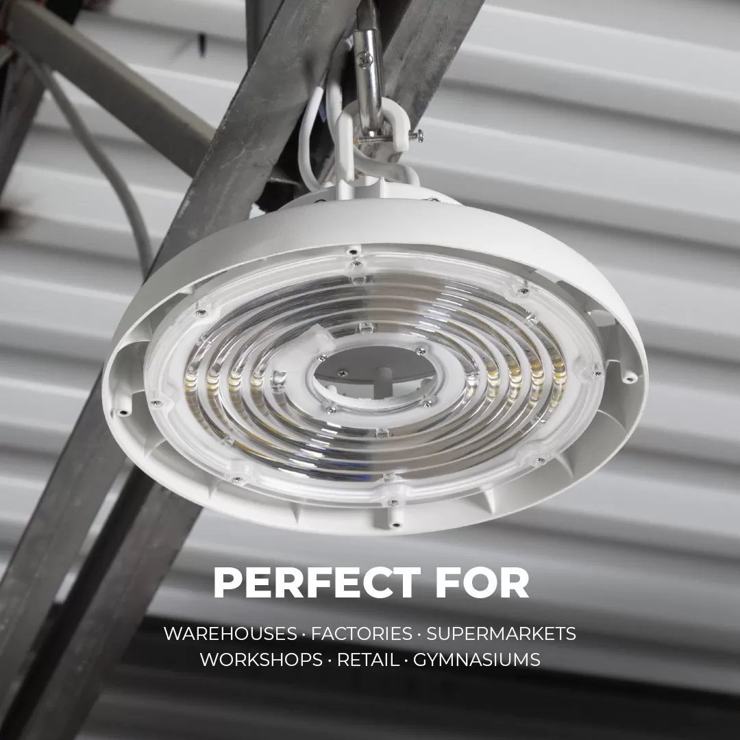 This LED UFO high bay light was designed to replace a 175W metal halide fixture. The low-profile is constructed with white powder-coated aluminum and an included polycarbonate reflector for uniform light distribution. Rated IP65, the high bay resists corrosion and moisture. Install with the included mounting hook and safety cable. Ideal for commercial applications such as warehouses, gymnasiums, and factories.