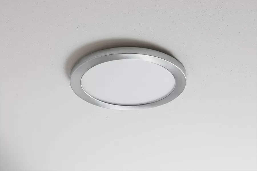 The low-profile dimmable 9″ downlight features a magnetic base with removable satin nickel trim. The light is customizable with optional trim rings to match your decor. Equivalent to 100W incandescent fixtures, it is ideal for new construction, remodeling, and retrofit applications. At 18W, the downlight delivers 1,440 lumens and is well-suited for use in kitchens, closets, hallways, and more. The included bracket and hardware flush mount directly to a junction box. For existing can light housing, use an optional 4″ or 5/6″ can light conversion kit (see accessories).