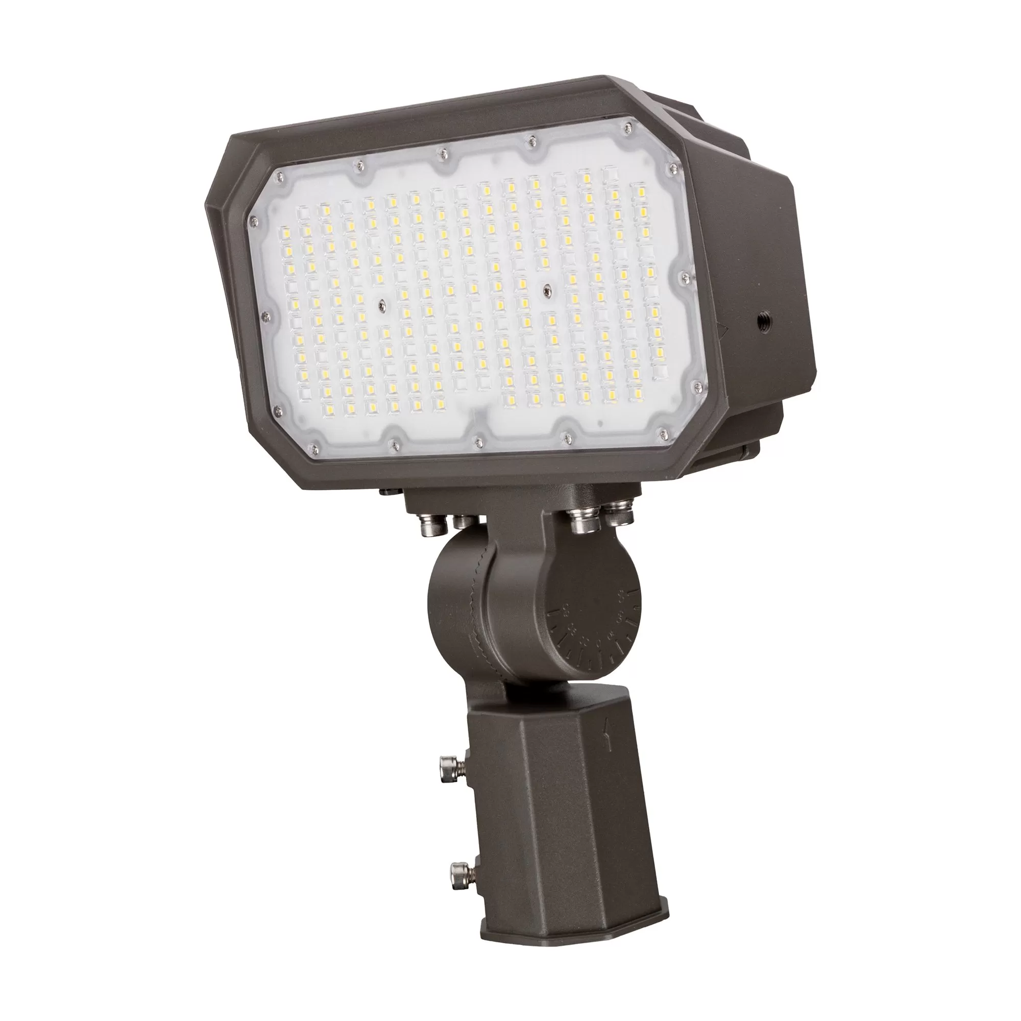 The energy-efficient 90-watt LED flood light has a high 140 lumens per watt efficacy and replaces traditional 250-watt metal-halide fixtures. Each light delivers 12,600 lumens and has 0-10 volt dimming. The floodlight features an 80-by-110-degree beam angle with a wide 7×7 NEMA distribution pattern. The long-lasting flood light has a durable die-cast aluminum housing and polycarbonate lens with an IP65 weatherproof rating for outdoor applications. Aim the fixture using the included pre-installed 180-degree adjustable slipfitter mount. Ideal for use in accent lighting, building facades, or parking lots.