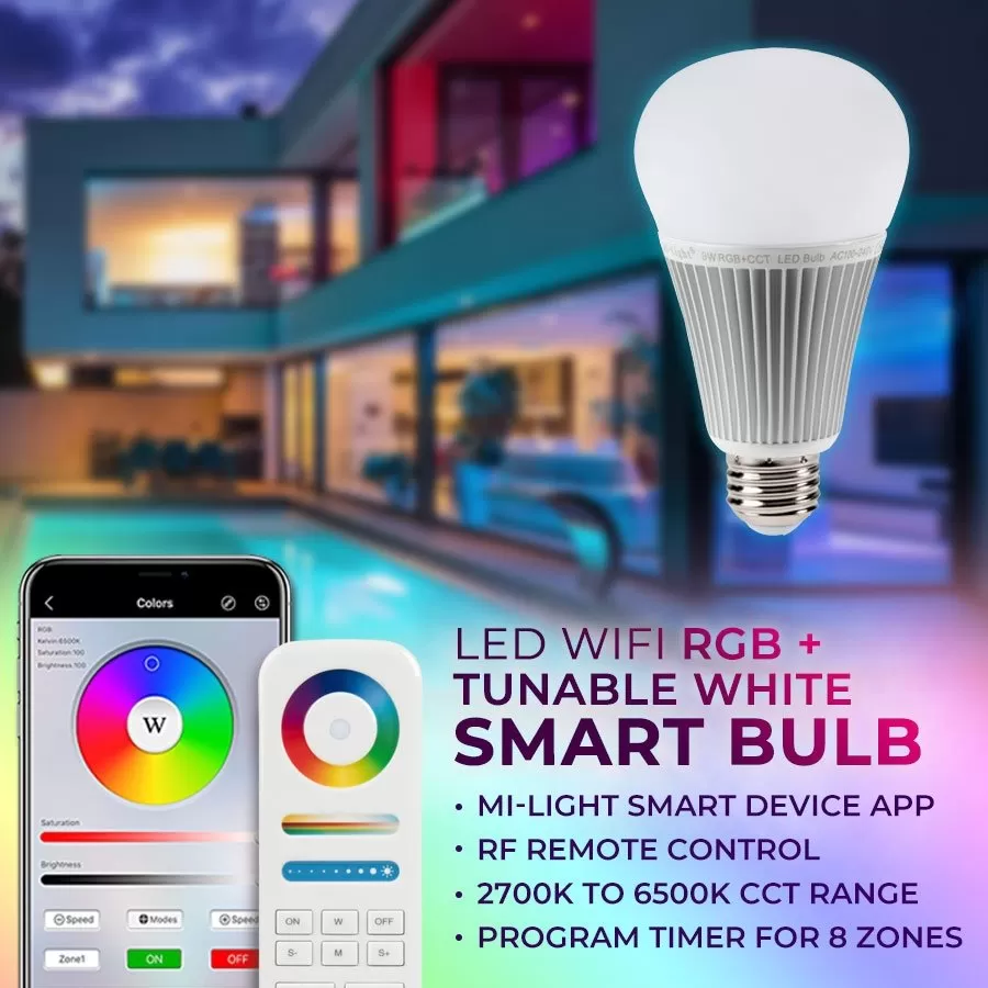 The A19 LED bulb features a range of RGB colors or white color temperatures from 2700K to 6500K up to 850 lumens. Control multiple A19 bulbs with the optional RF remote up to 100 feet away. Choose from various color-changing/white modes, and adjust speed, brightness, and saturation. Power-cycle mode retention allows your bulb to return to the mode used before the light was powered off. The remote also allows you to control up to 8 zones (groups) of lights. The bulb is ideal for track lighting, recessed applications, desk lamps, or outdoor applications with waterproof housings.