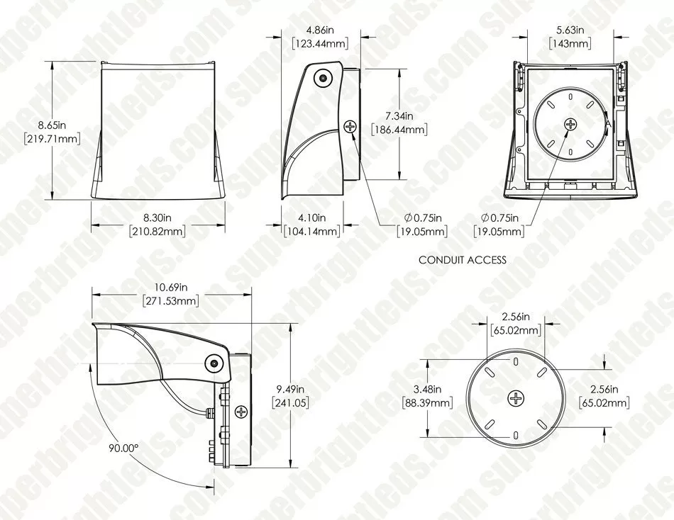 This full cutoff wall pack features adjustable housing and field selectable CCT. The adjustable housing can be rotated 90° to precisely aim light and the full cutoff design eliminates wasted light. Field selectable CCT allows color temperature to be chosen during installation. Photocell is integrated for dusk-to-dawn operation. Weatherproof IP65 rating protects the fixture in wet conditions. Power with one of 5 conduit entry points: one on each side and one on the back of the housing.
