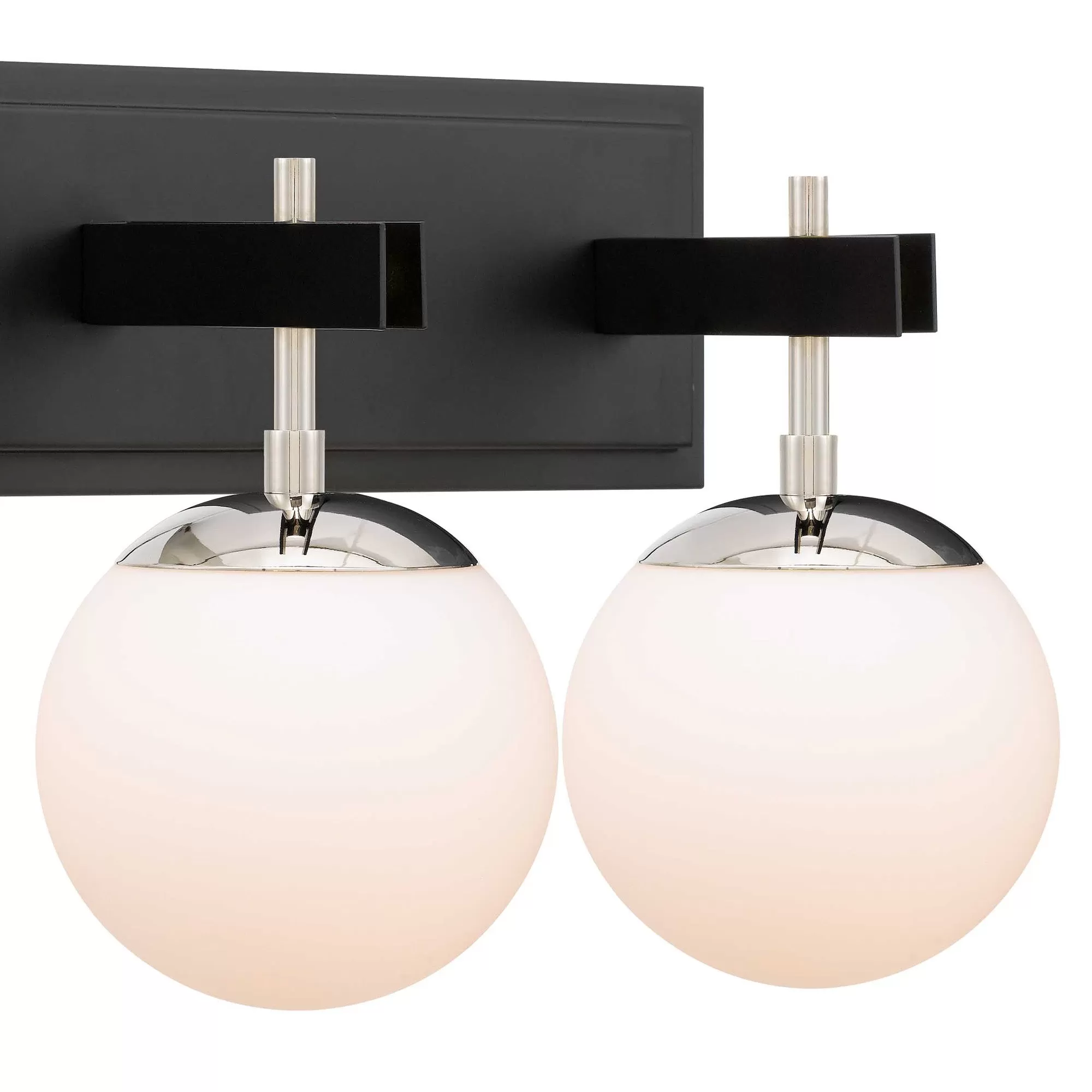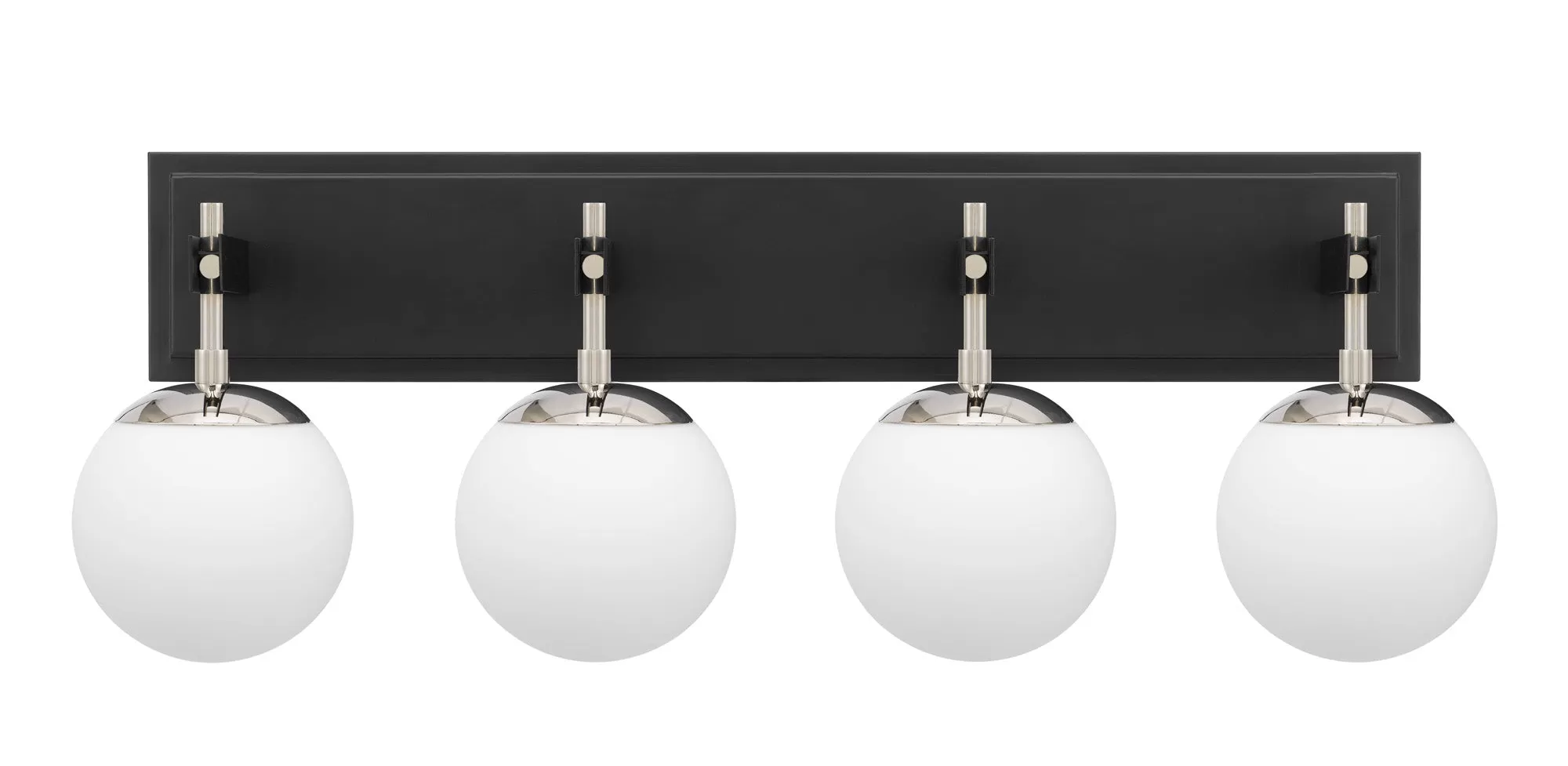 Mid-Century and Post Modern Design Influences. Gorgeous White Recycled Glass Globes. Easy Re-lamping. Two Tone Satin Black with Brass or Polished Nickel with Black Finshes.